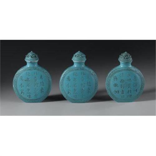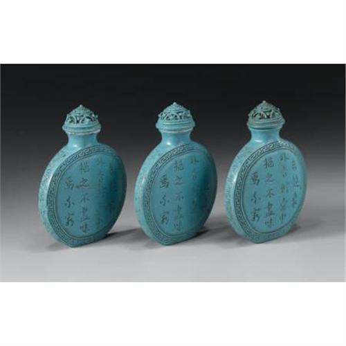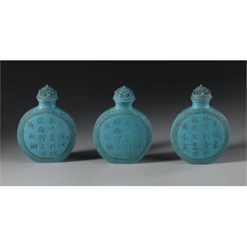 <B>Three Snuff Bottles<BR></B></I><BR>Three faux turquoise flattened, rounded snuff bottles with character designs all over<BR>Each 2-1/2in. high<BR><BR> <B>Condition Report:</B> Normal signs of wear as appropriate with age.<BR><BR><b>Shipping:</b> Bottles, Jars & Containers (<a target="_blank" href="http://www.heritageauctions.com/common/shipping.php">view shipping information</a>)