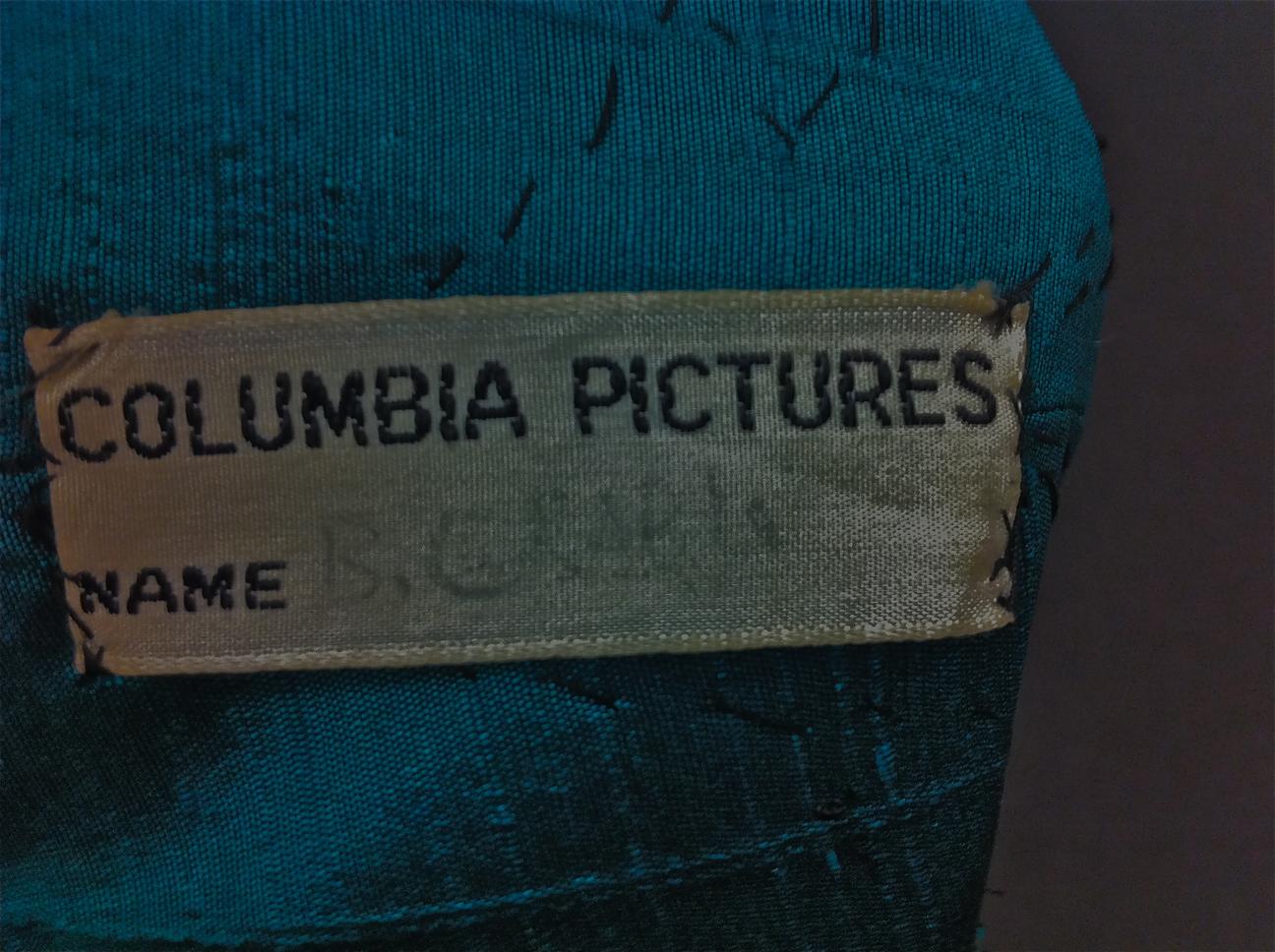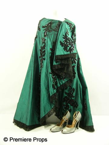Three for the Show (1955) - Julie Lowndes (Betty Grable) screen worn 'Columbia Pictures' cape gown. The cape is green with black sequin detail and black lace trim. The cape has a clip and snap buttons at the neck. To complete this costume are a pair of silver sparkle ankle strap peep toes. Inside is a vintage Columbia Pictures label with her name written on it. The dress was matched to the film by a costume historian.