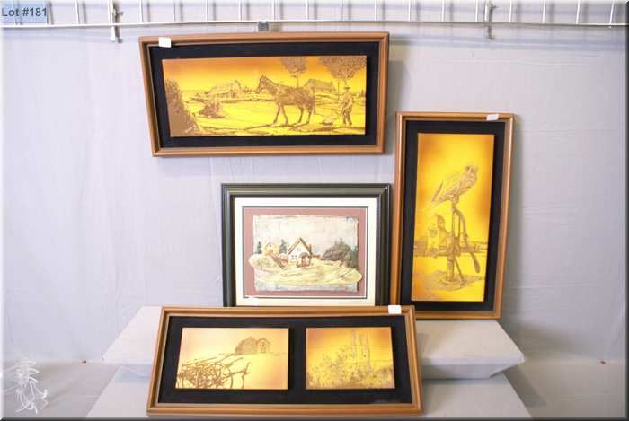 Three framed art works depicting farm scenes and a painted clay "A Peaceful Day on the Farm" signed by artist M. Fetherston
