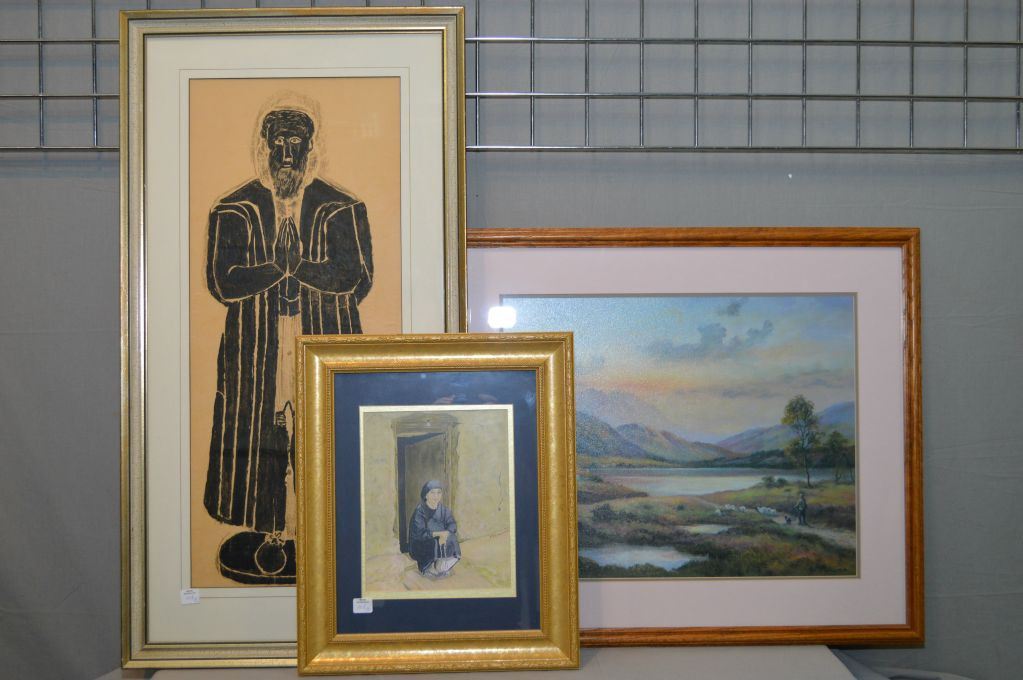 Three framed artworks including charcoal rubbing, Wendy Reeves highlands print and a figure in a doorway print