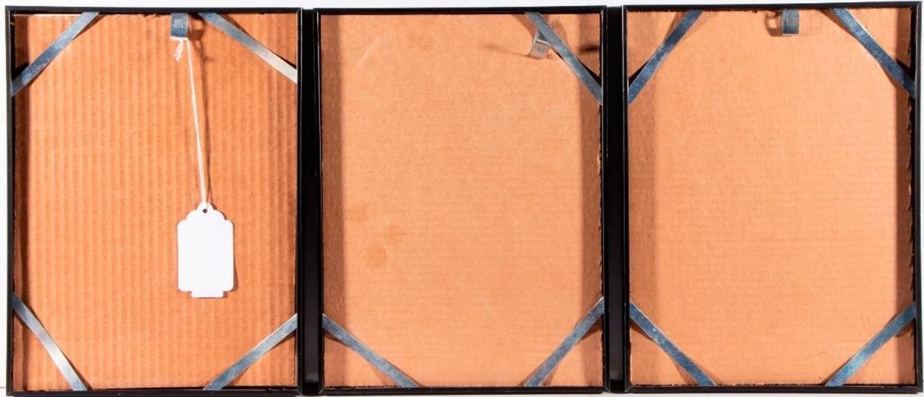 Three framed block prints. Artwork: Height-6 inches; Width-4 inches. Frame: Height-12 1/2 inches; Width-9 1/2 inches.