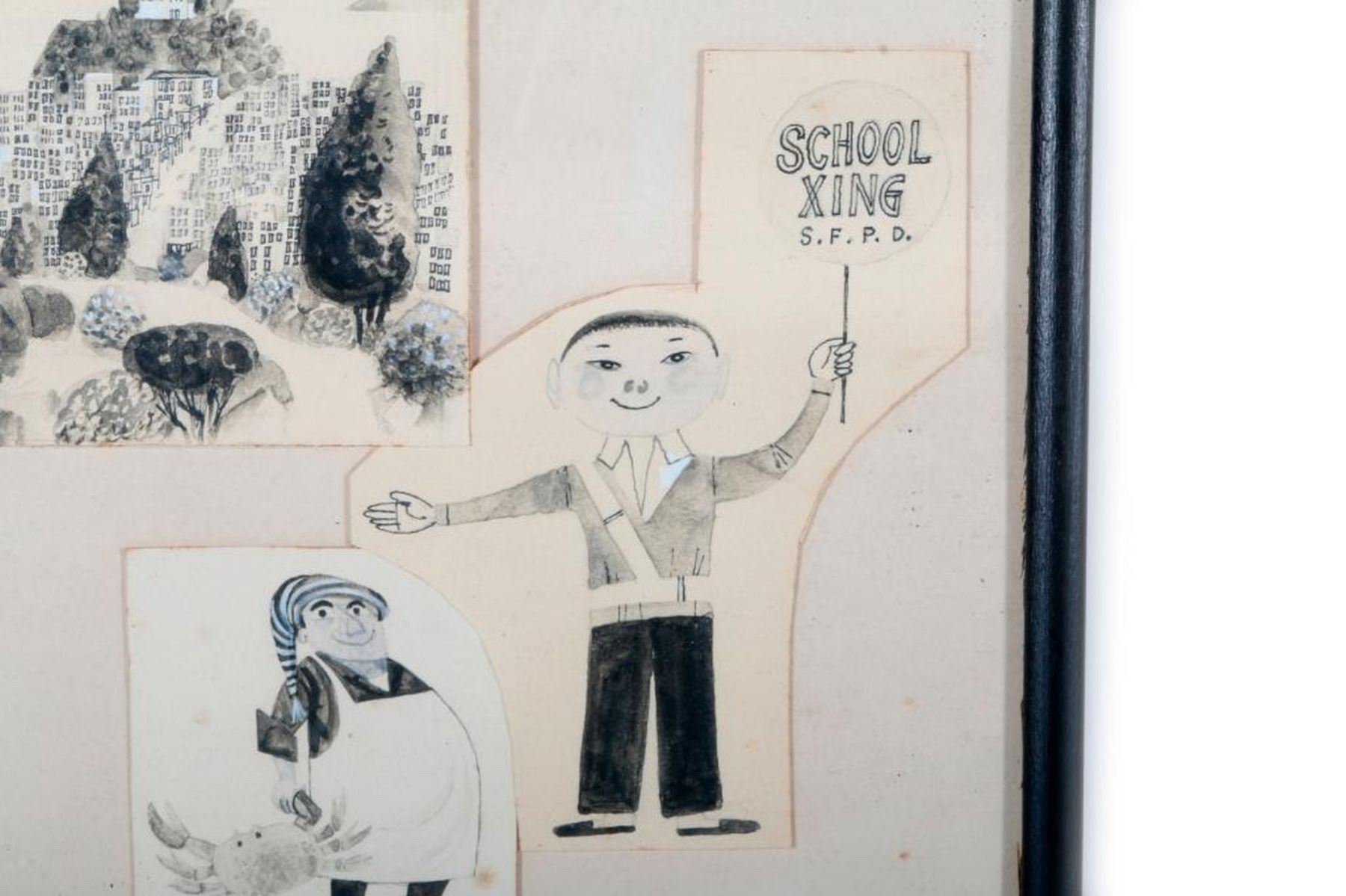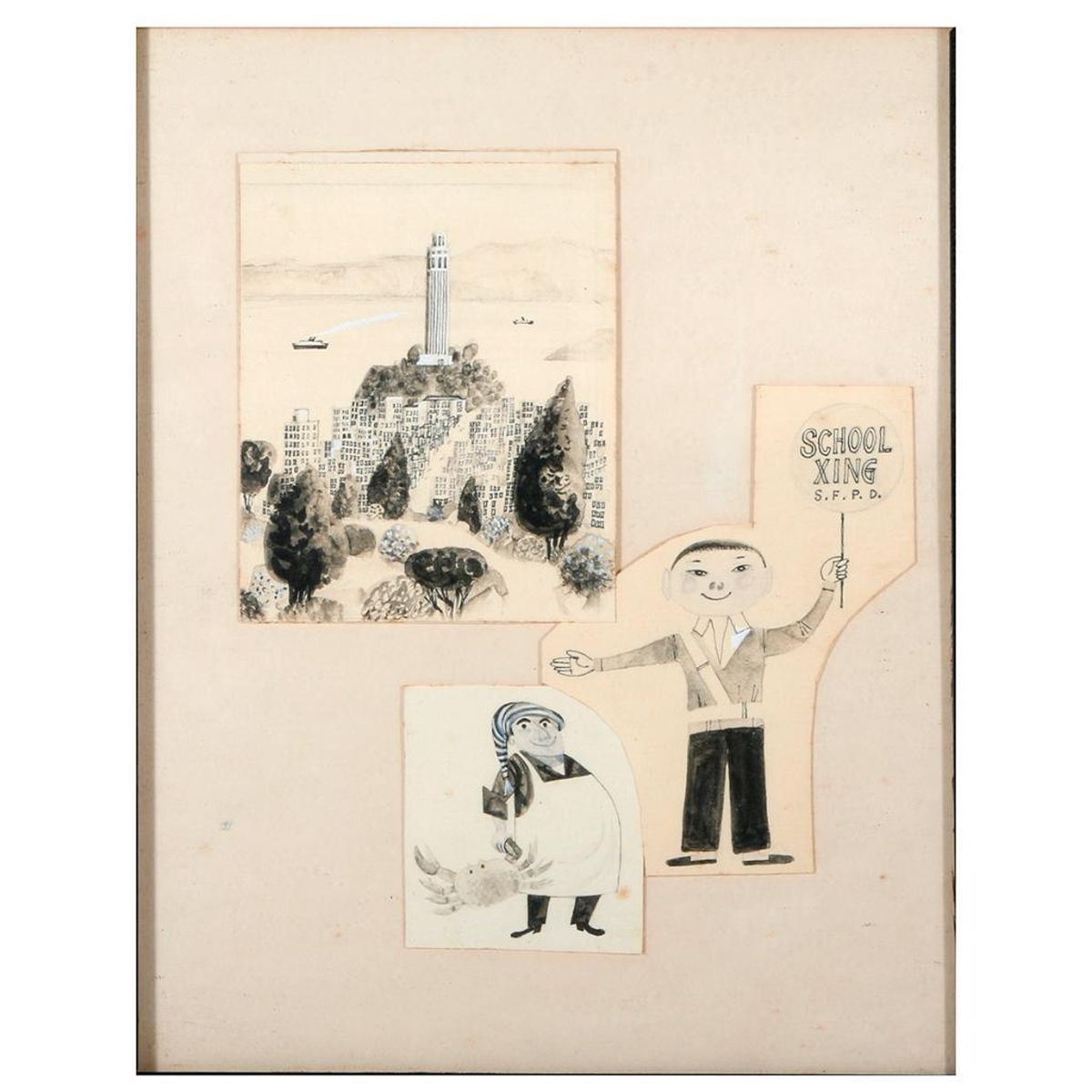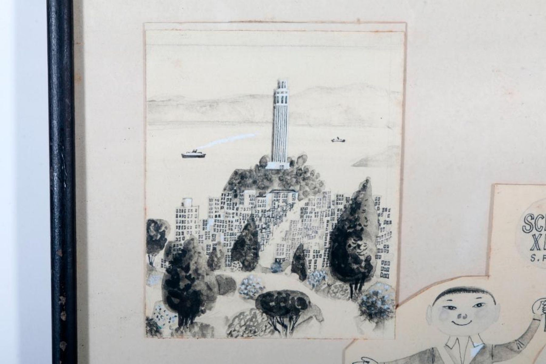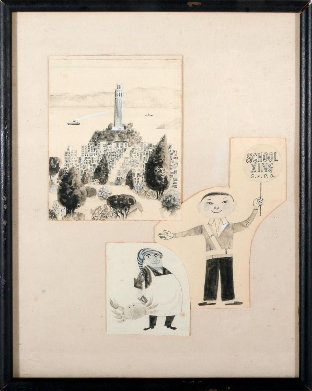 Artist: Unsigned. Subject/Title: Three pen and ink drawings of San Francisco and citizens. Date Created: Circa 1960. Size Image: 10 1/4 inches high x 8. Size Frame: 11 1/4 inches high x 9. Condition: Good.