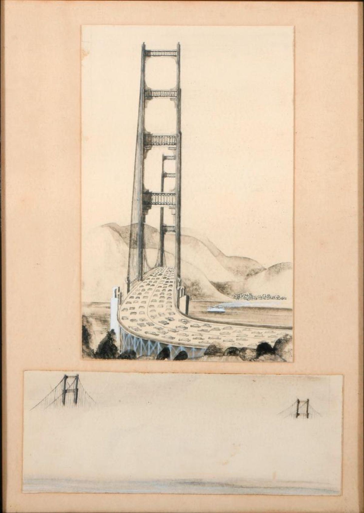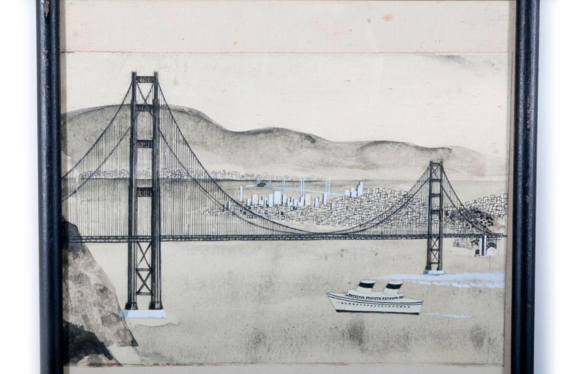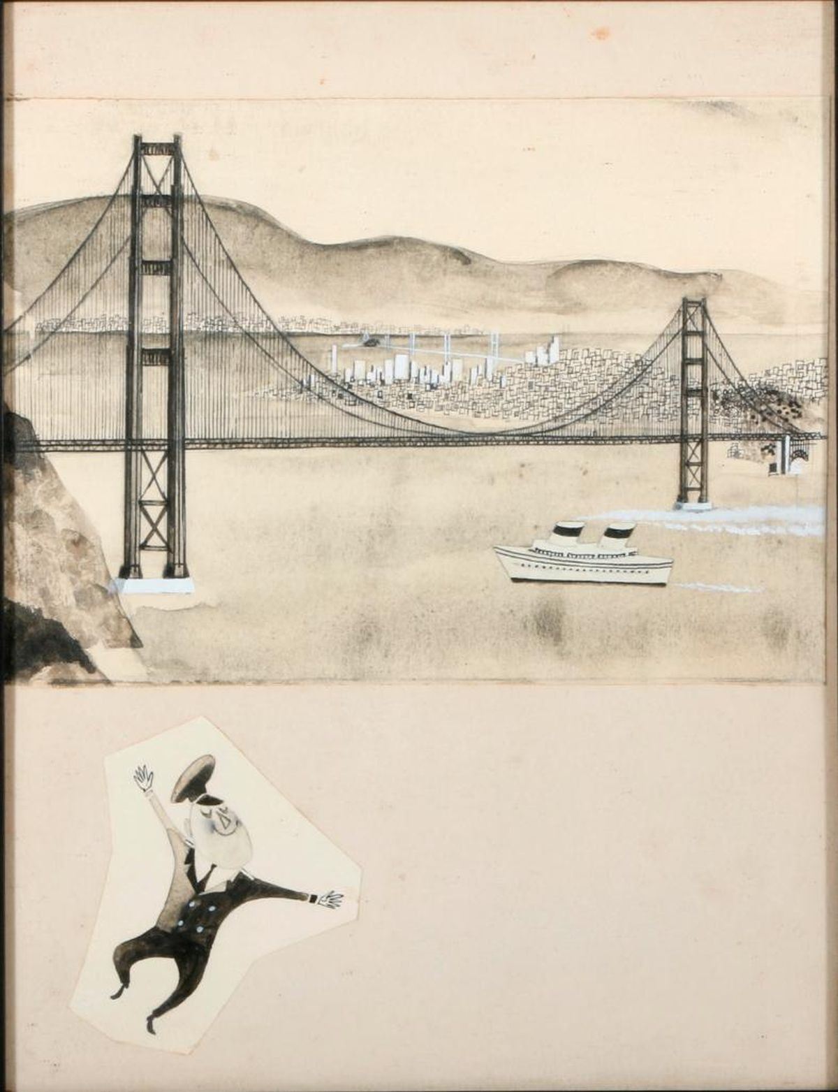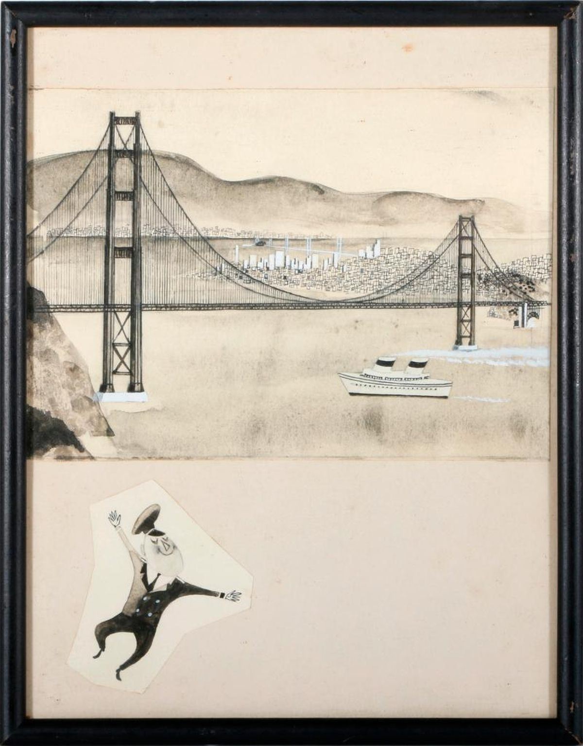 Artist: Unsigned. Subject/Title: Three pen and ink drawings of San Francisco and citizens. Date Created: Circa 1960. Size Image: 10 1/4 inches high x 8. Size Frame: 11 1/4 inches high x 9. Condition: Good.