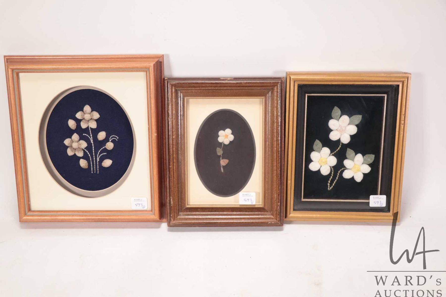 Three framed moose tufted flowers including two 9 1/4" X 7 1/4" and one11" X 9 1/2", overall dimensions including frames