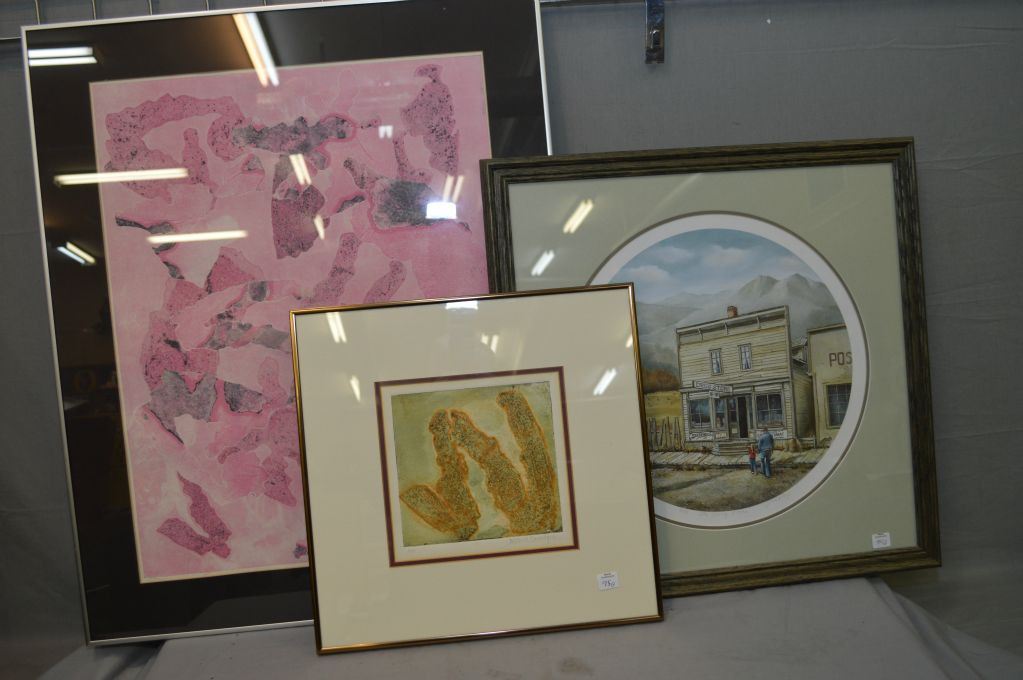 Three framed prints including Joan Healey "The Drugstore" two Oksana prints including a 1/1 artist proof