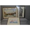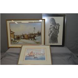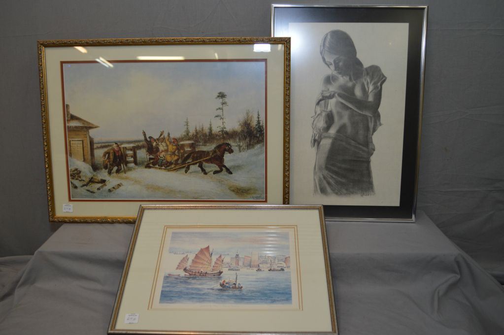 Three framed prints including "Running the Toll Gate" Kreghoff print, a black and white etched style nude and a Oriental junks in harbour scene
