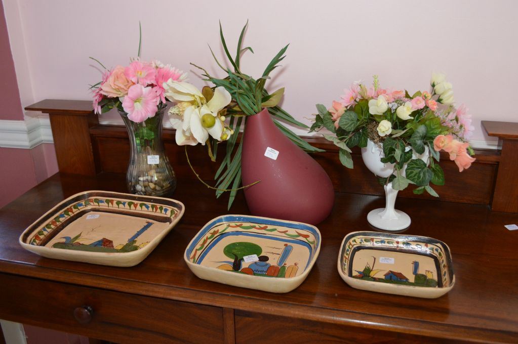 Three hand painted ceramic plates with pictorial themes plus a comport and two vases