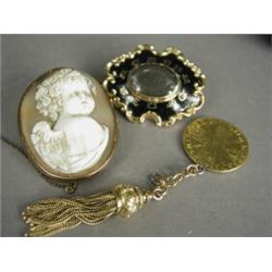 Three items: A mourning brooch, cameo brooch and a mounted guinea with tassel Est. 80/120...