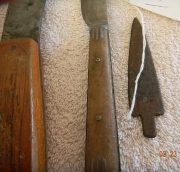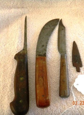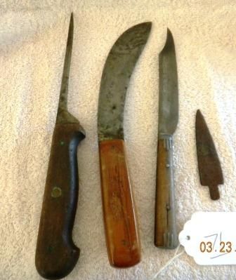 The arrow point measures 3 1/2 x 1 inch and is from 1800's, the three knives are 10, 10 and 9 inches. All have heavy wear. Shipping $20.00.