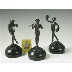 Three late 19th Century miniature bronze figures each representing a fawn playing a musical instrument and raised on a turned slate socle. 14cm high, some damage