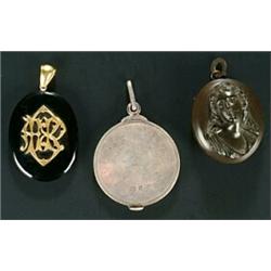 Three lockets, comprising; a silver round locket with reeded borders enclosing a lock of hair, Birmingham 1901 by Deakin & Francis, a jet oval locket with an applied monogram and a panel engraved with a spray of flowers, and a bakelite cameo locket