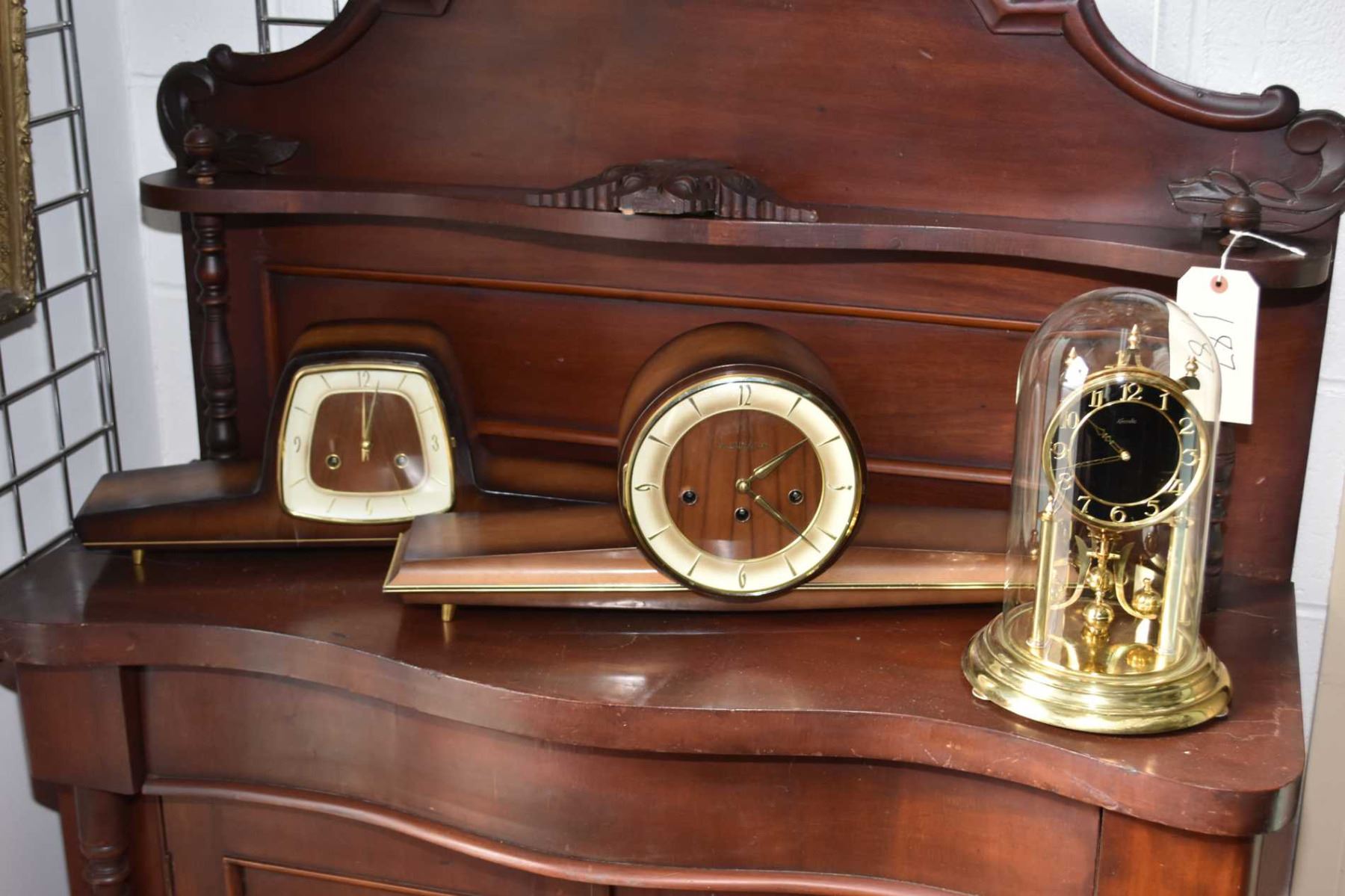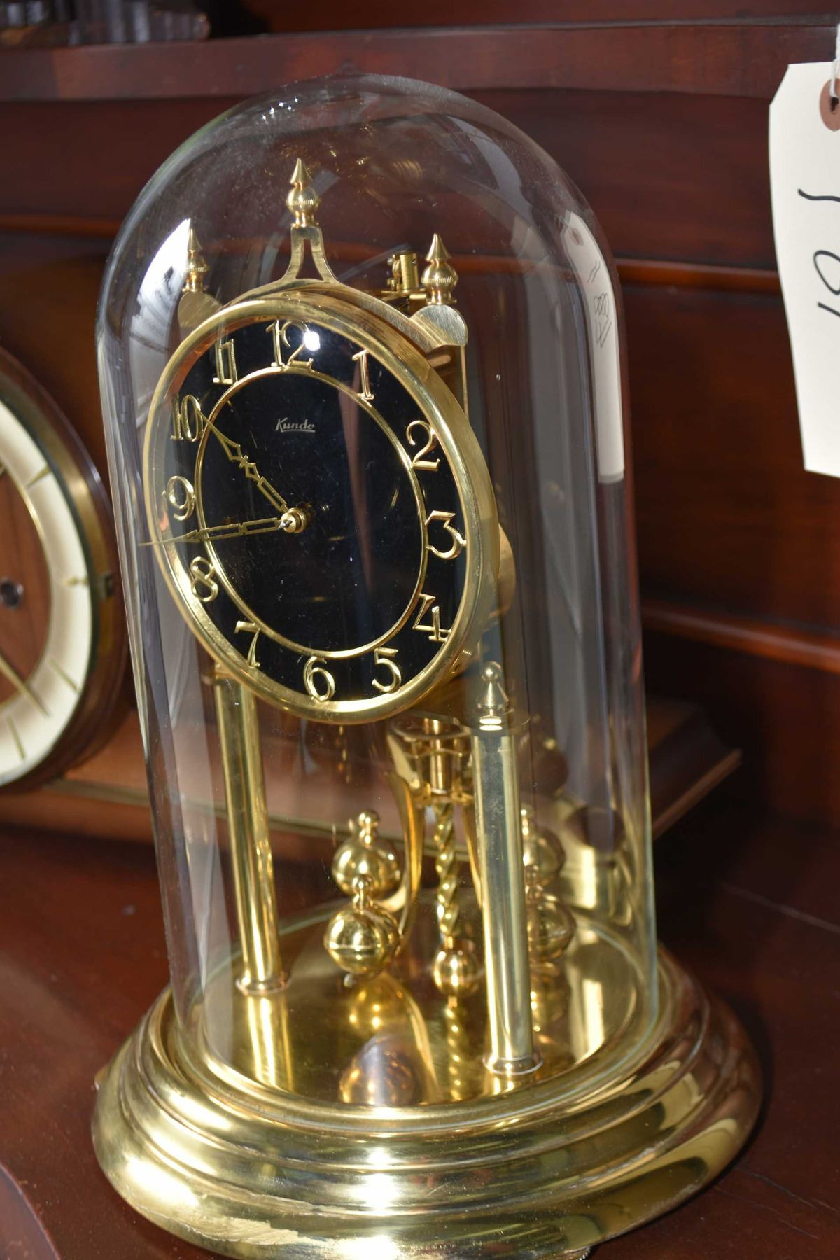Three mantle clocks including two mid century walnut clocks and a Kundo glass domed anniversary clock