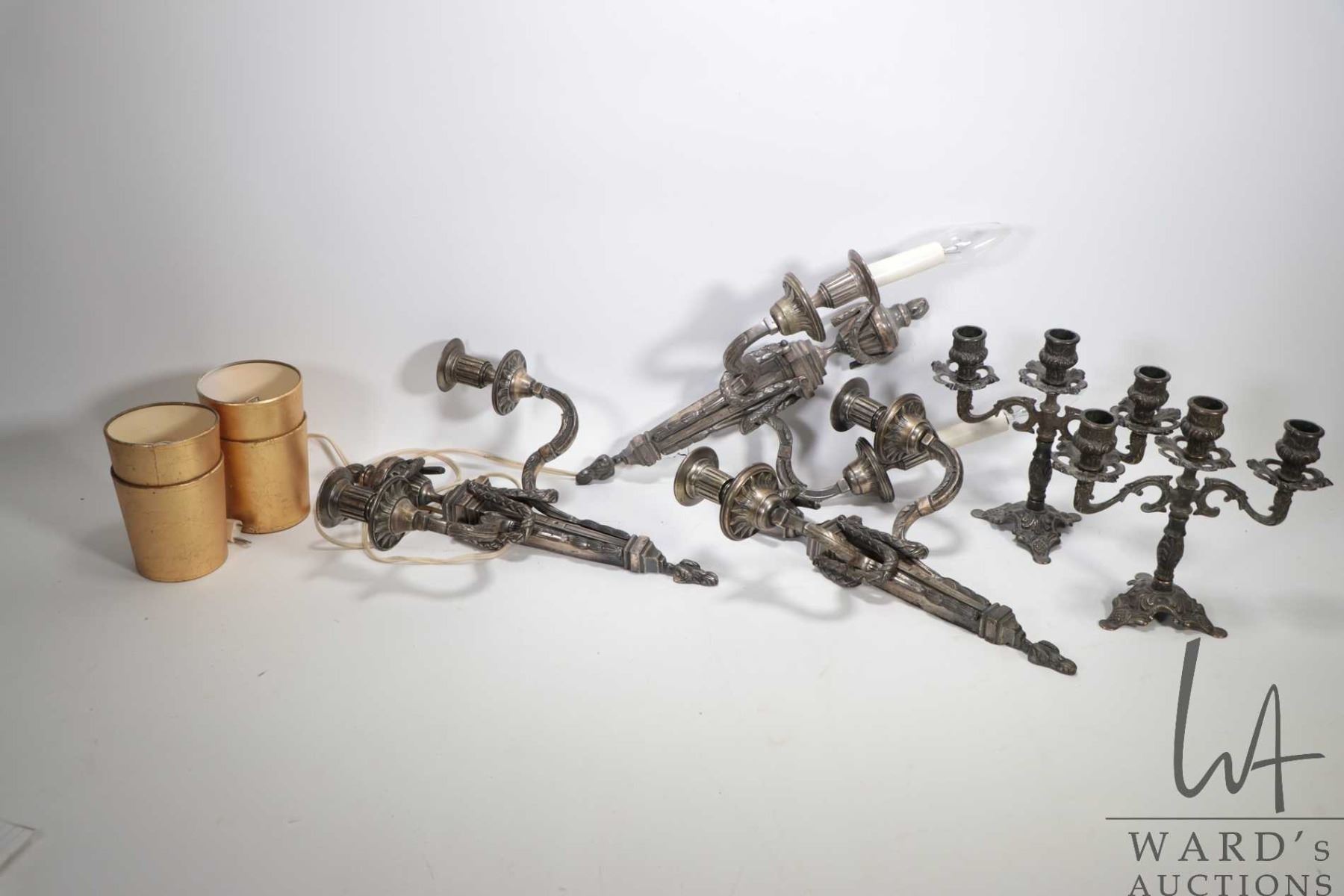 Three matching 14" high candle sconces including one electrified and two candelabras
