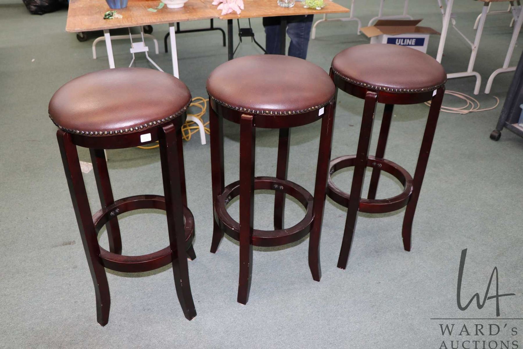 Three matching modern bar stools with leatherette upholstered seats, 30" in height