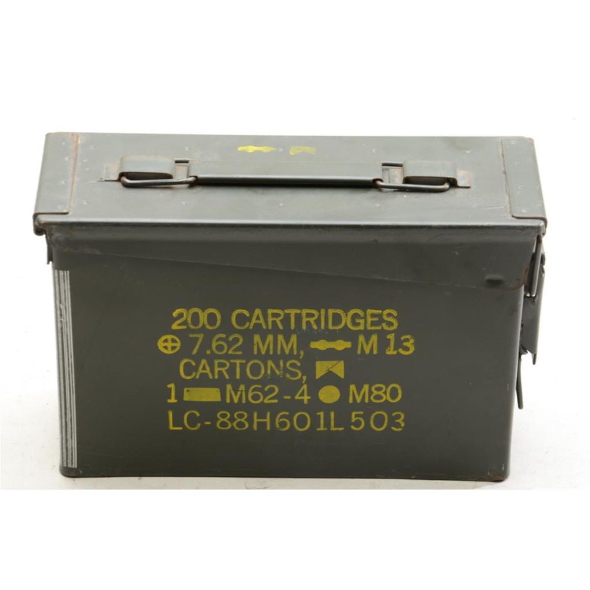 Three military metal ammo cans of misc. boxes of cartridges: one in .30 caliber bandoliers by Twin Cities Ordinance and Greek Powder & Cartridge Co.; one can with 7.62mm ball caliber in bandoliers and one can also in .30 caliber bandoliers by Greek Powder & Cartridge Co. Est.: $200-$300.