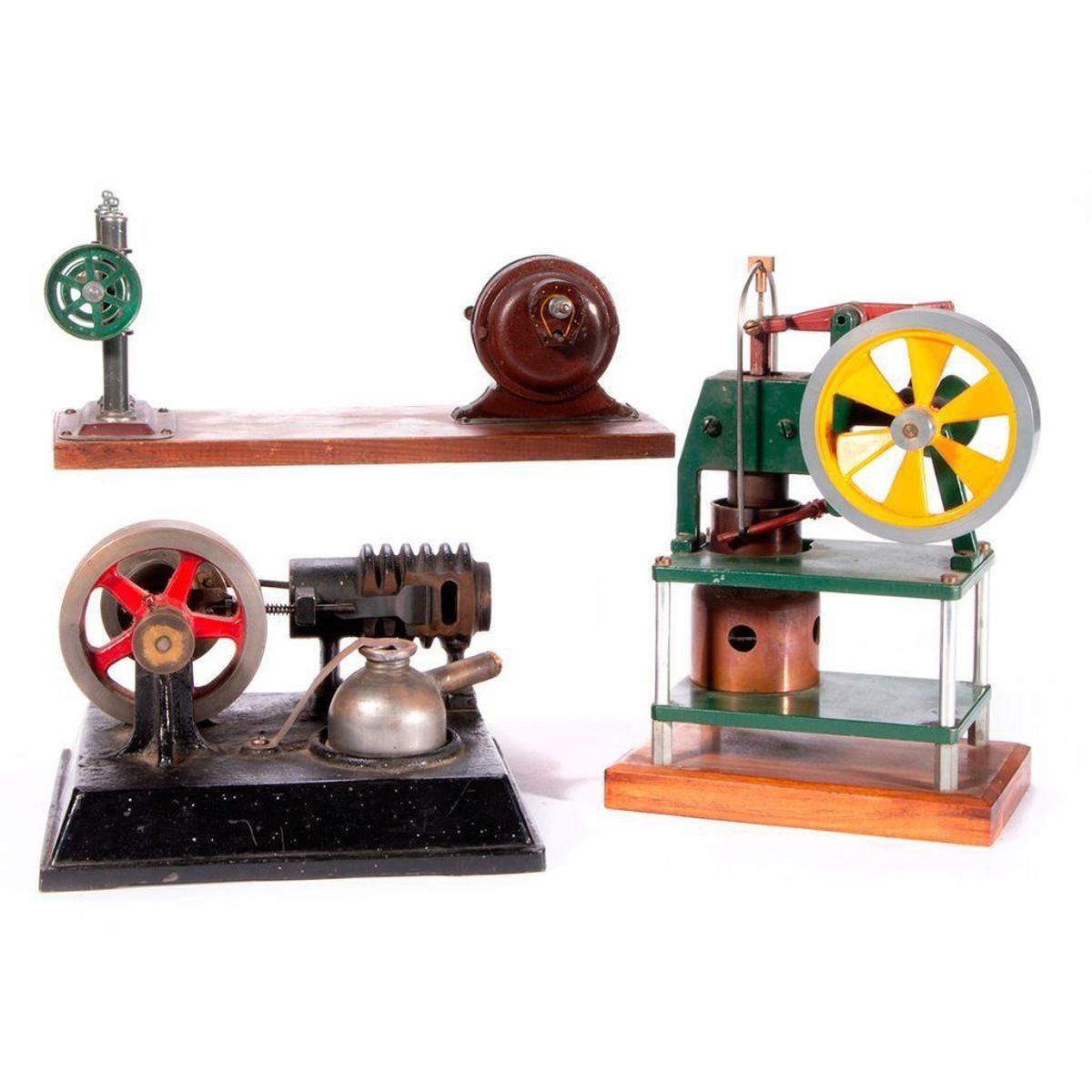 A mid-century model Stirling Hot Air machine measuring 9 inches high x 6 1/4 x 4. An early 20th century Dinamobil marked Orig. Hess. 5 inches high x 10 1/2 x 4 3/4. An early 20th century model factory machine marked E. R. McCuckin, Ridgewood N. J. measuring 5 inches high x 7 square. All as shown. Items are sold as is. Please inquire about condition if not otherwise stated.