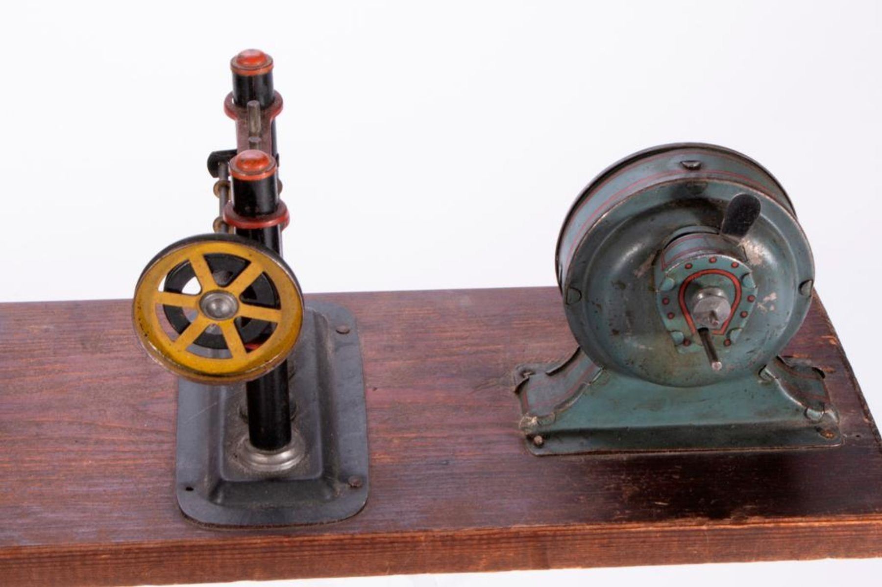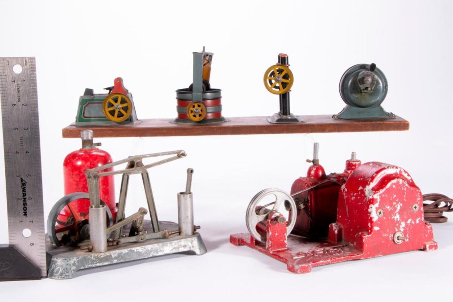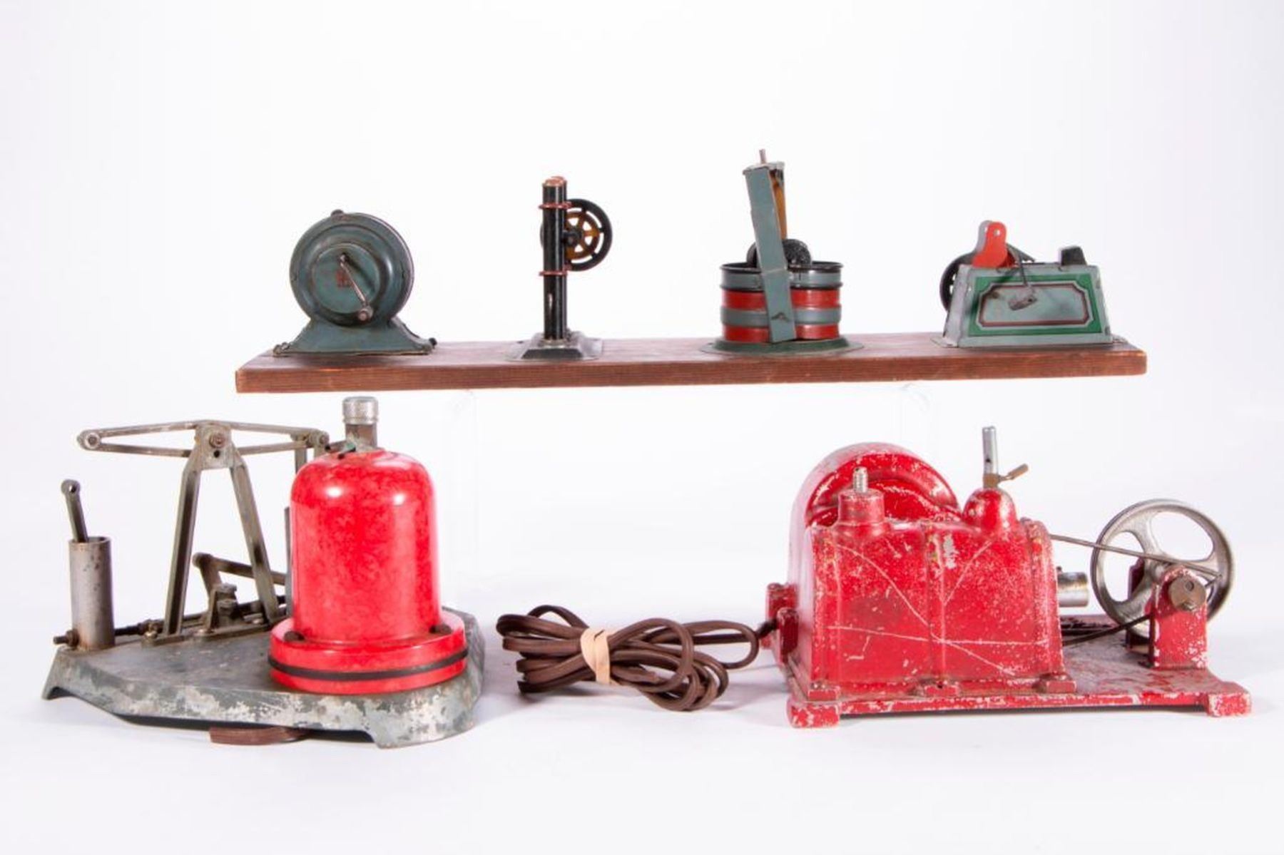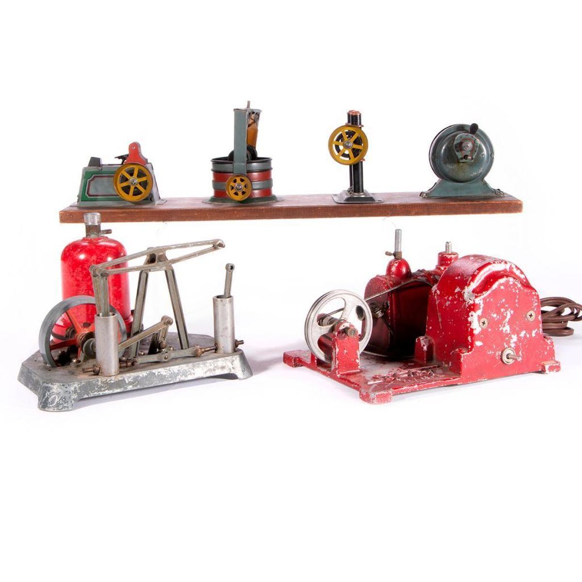 Three vintage model factory machines: a steam engine measuring 6 inches high x 8 x 8, a Safe Toy steam engine measuring 5 inches high x 8 x 6 1/2, and a possibly German machine row set marked H J L measuring 5 inches high x 18 1/2 x 4 3/4. As shown. Items are sold as is. Please inquire about condition if not otherwise stated.