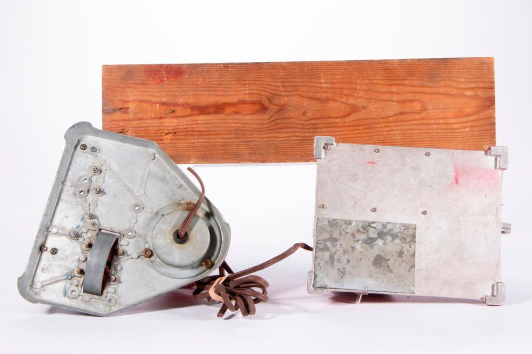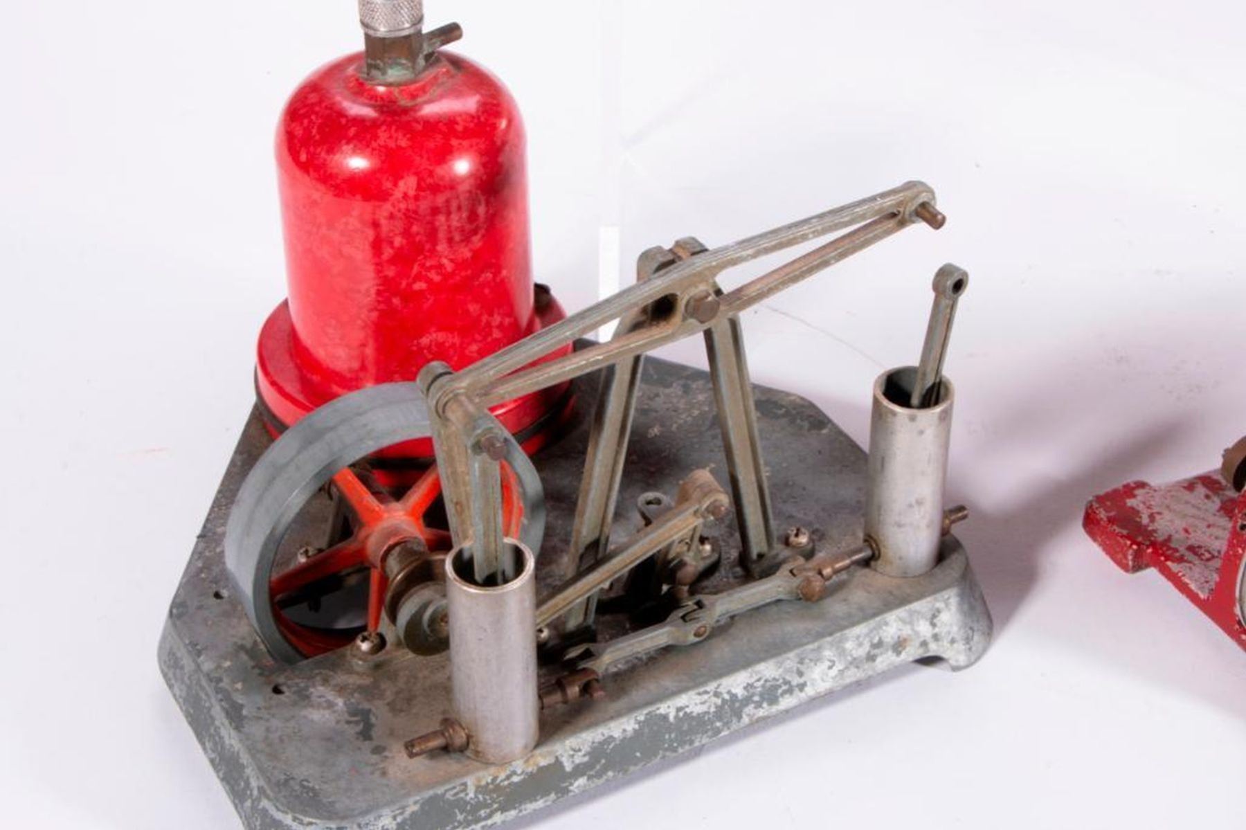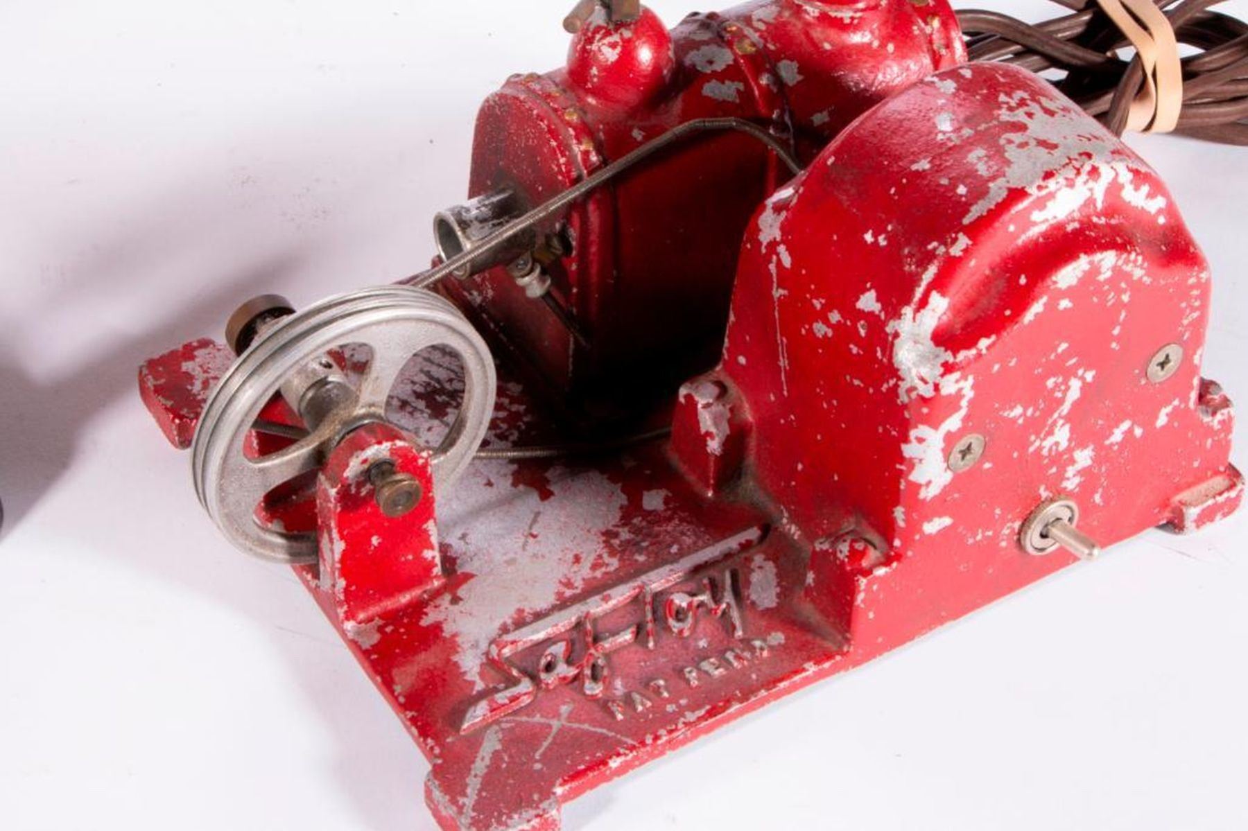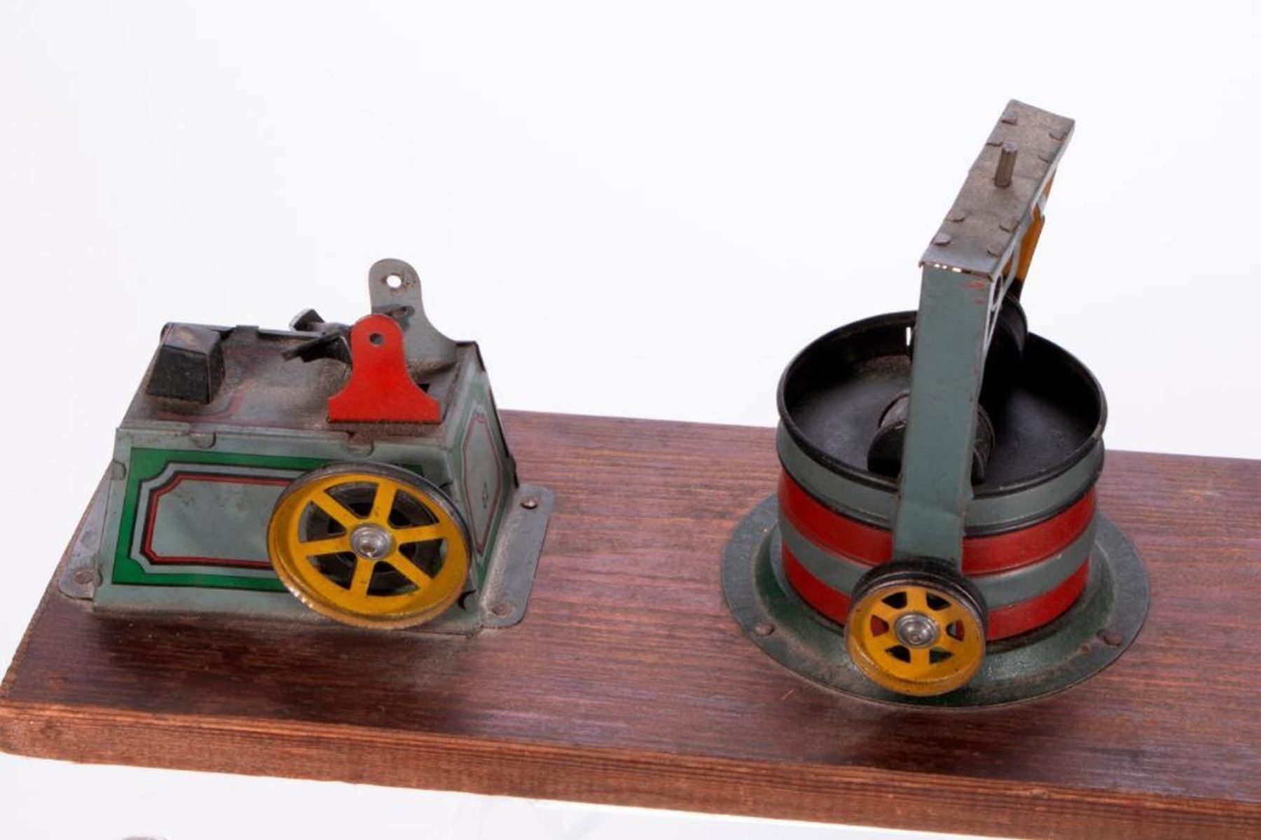 Three vintage model factory machines: a steam engine measuring 6 inches high x 8 x 8, a Safe Toy steam engine measuring 5 inches high x 8 x 6 1/2, and a possibly German machine row set marked H J L measuring 5 inches high x 18 1/2 x 4 3/4. As shown. Items are sold as is. Please inquire about condition if not otherwise stated.