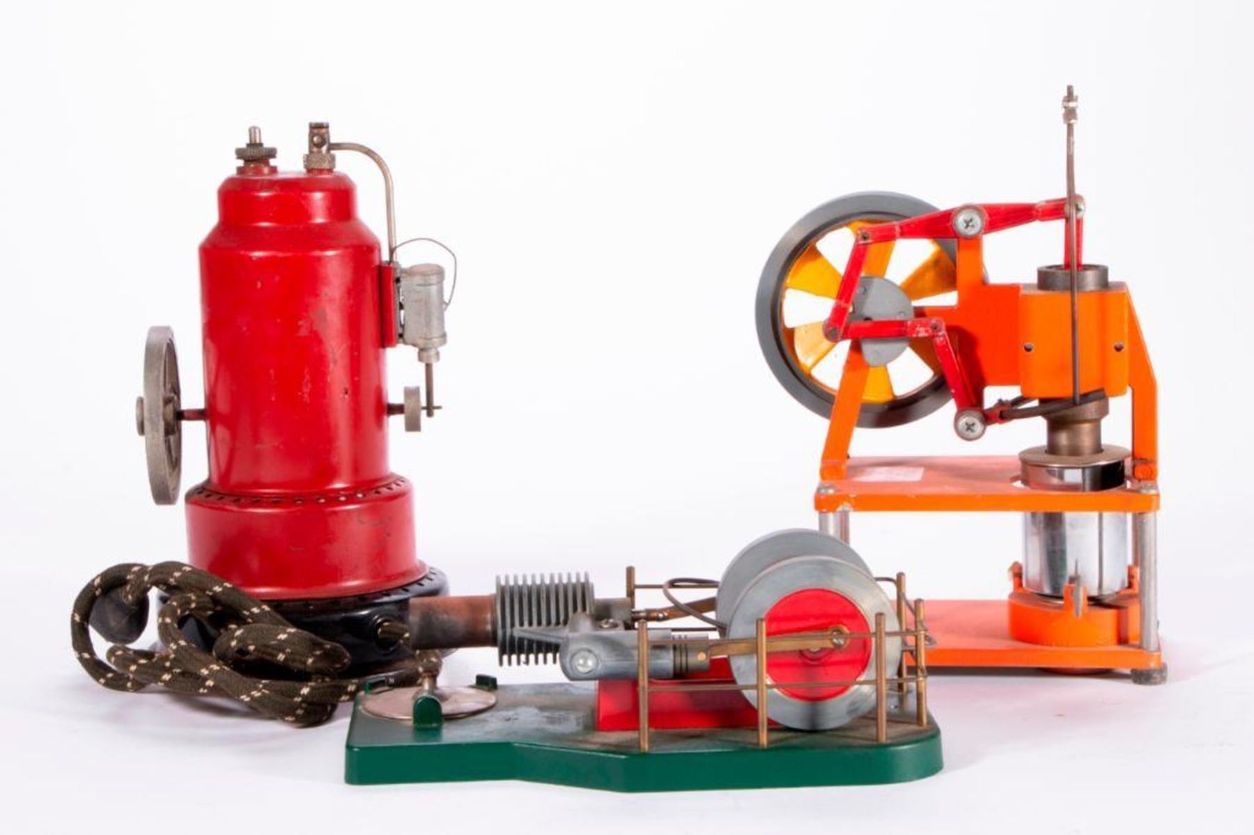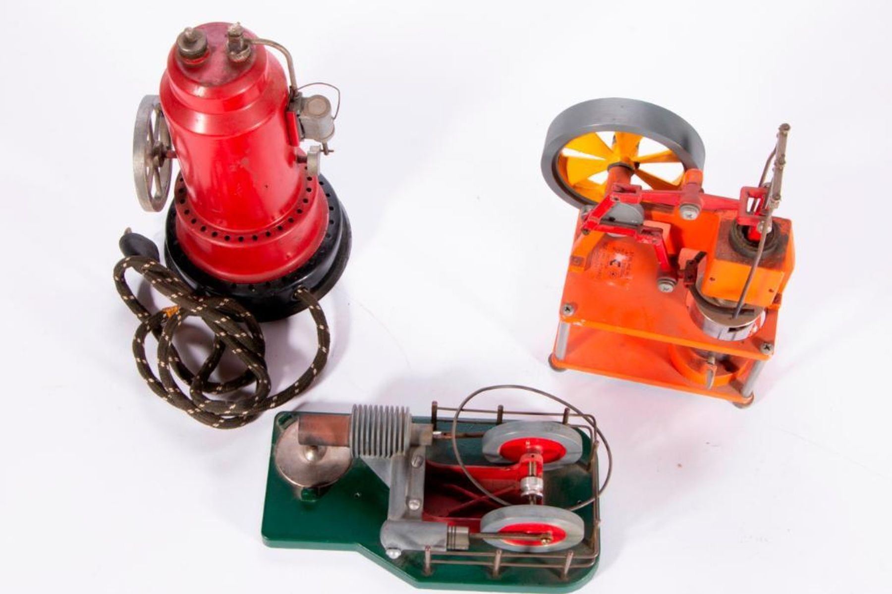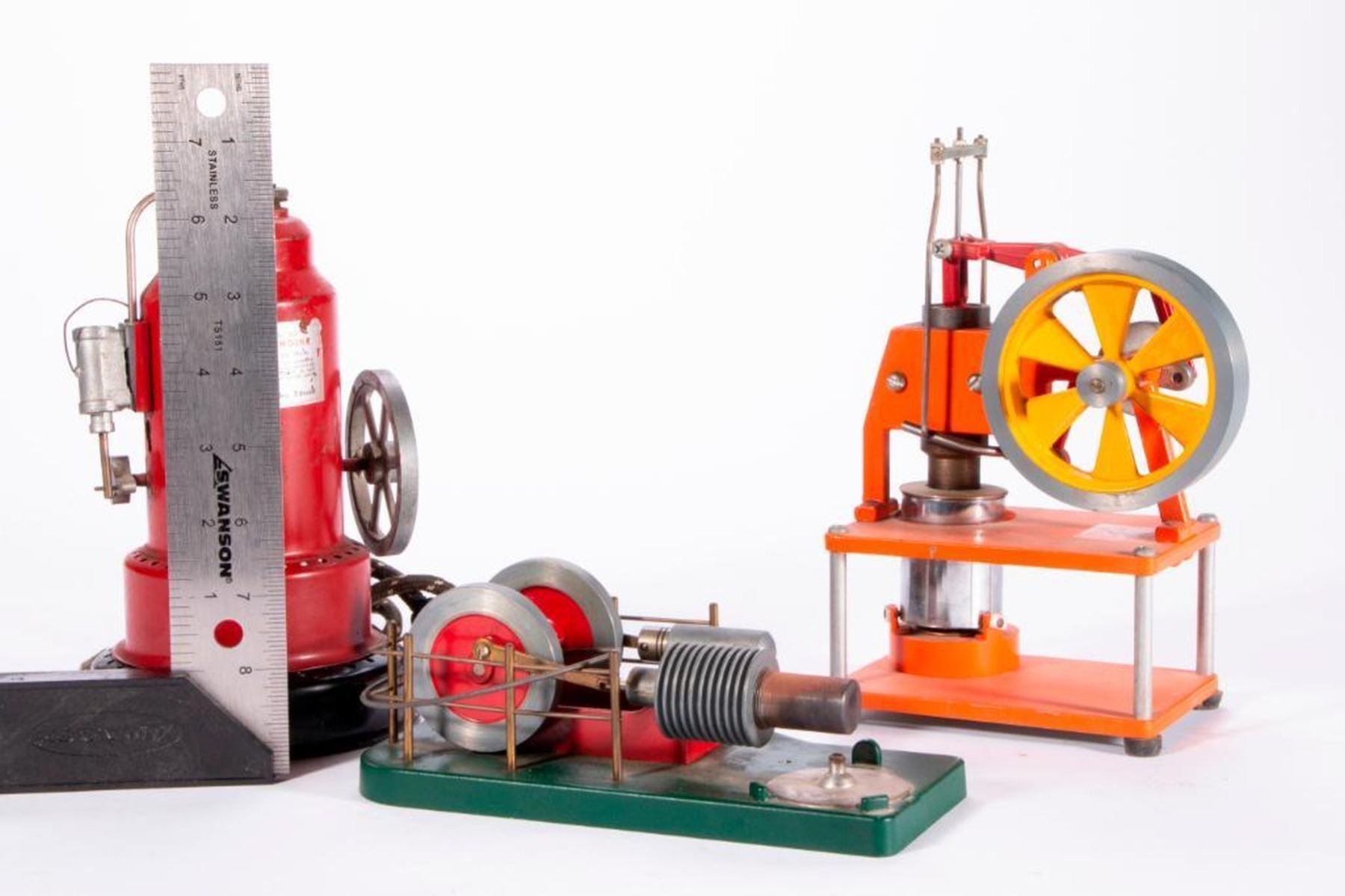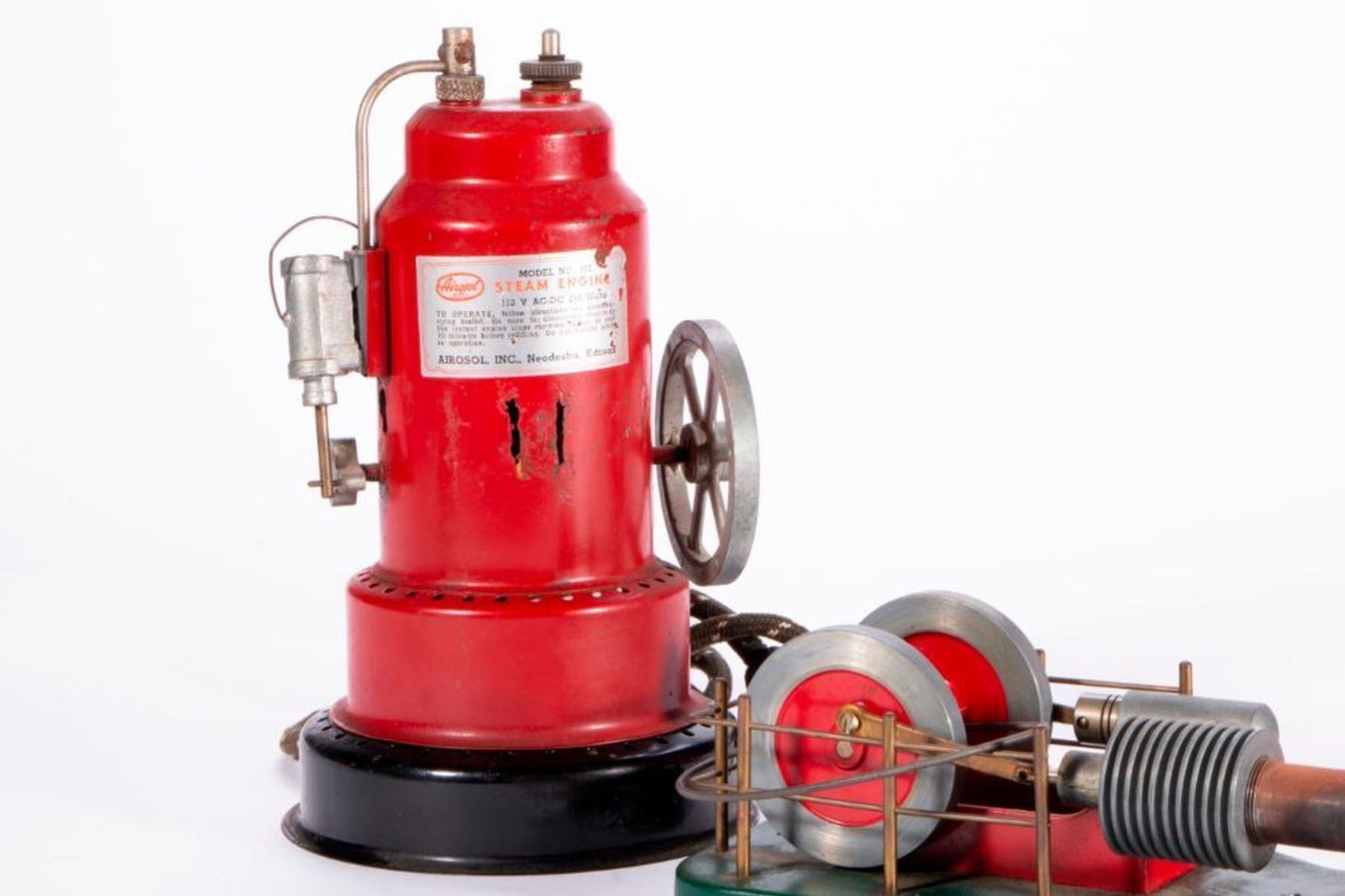 Two vintage Stirling Hot Air engines the largest measuring 8 inches high x 5 x 3 1/2, and a vintage Airosol steam engine measuring 9 inches high x 5 diameter. As shown. Items are sold as is. Please inquire about condition if not otherwise stated.
