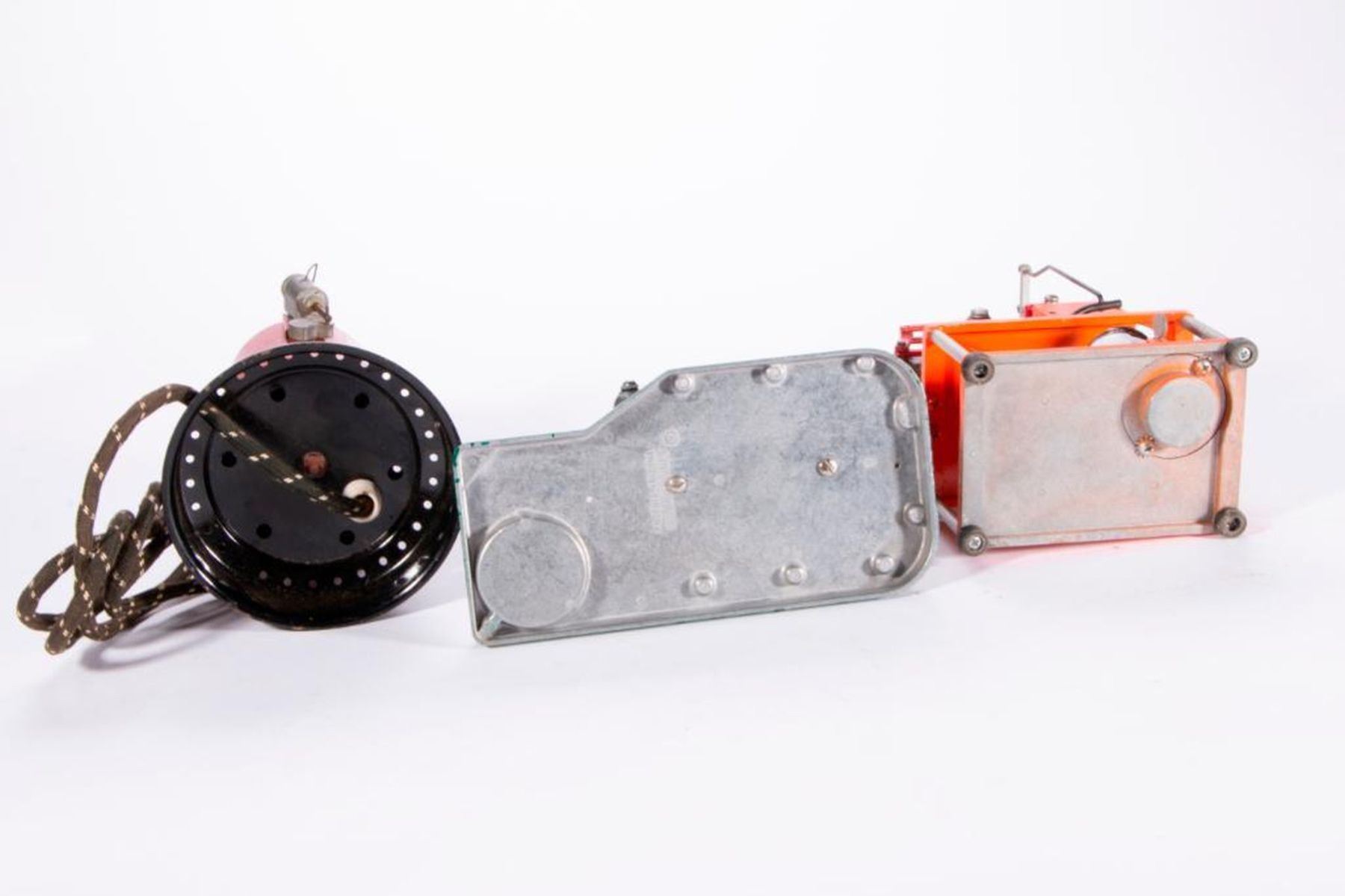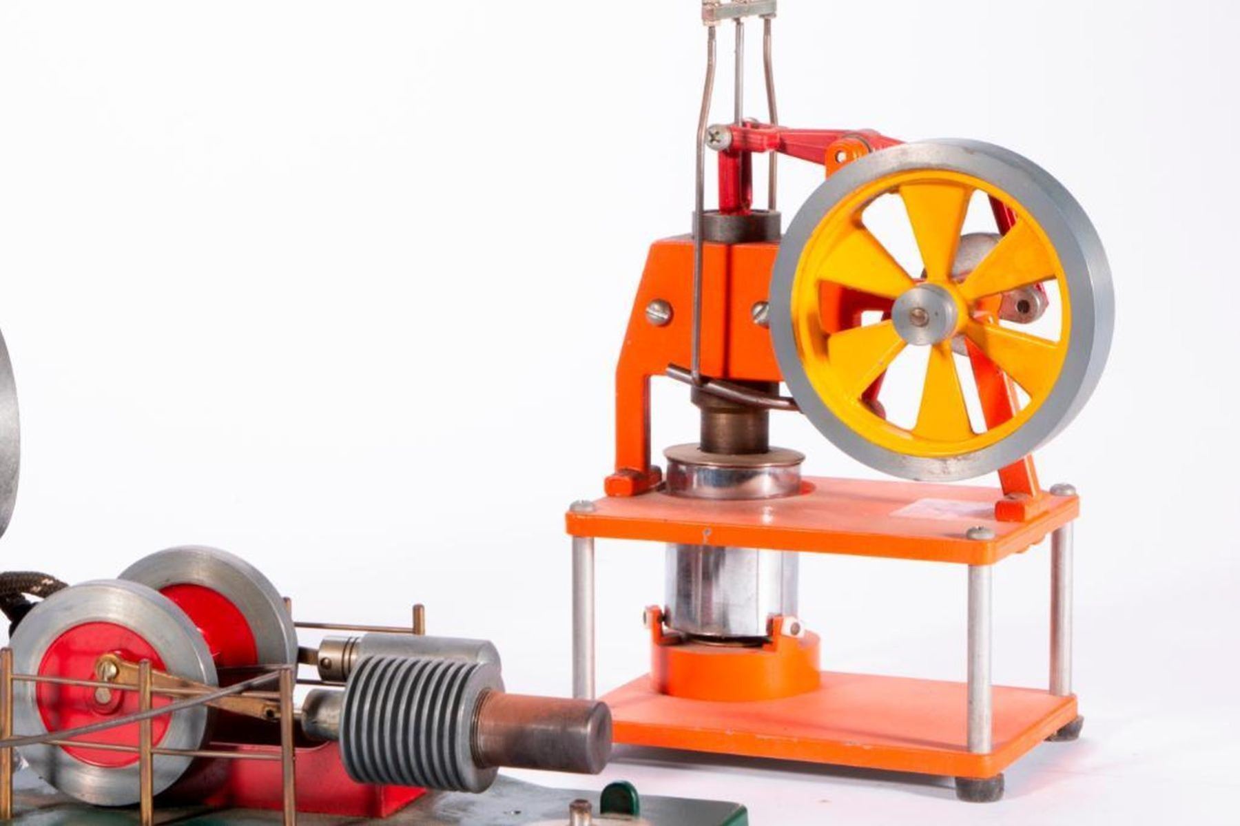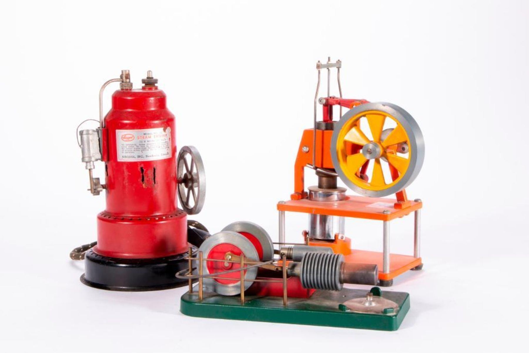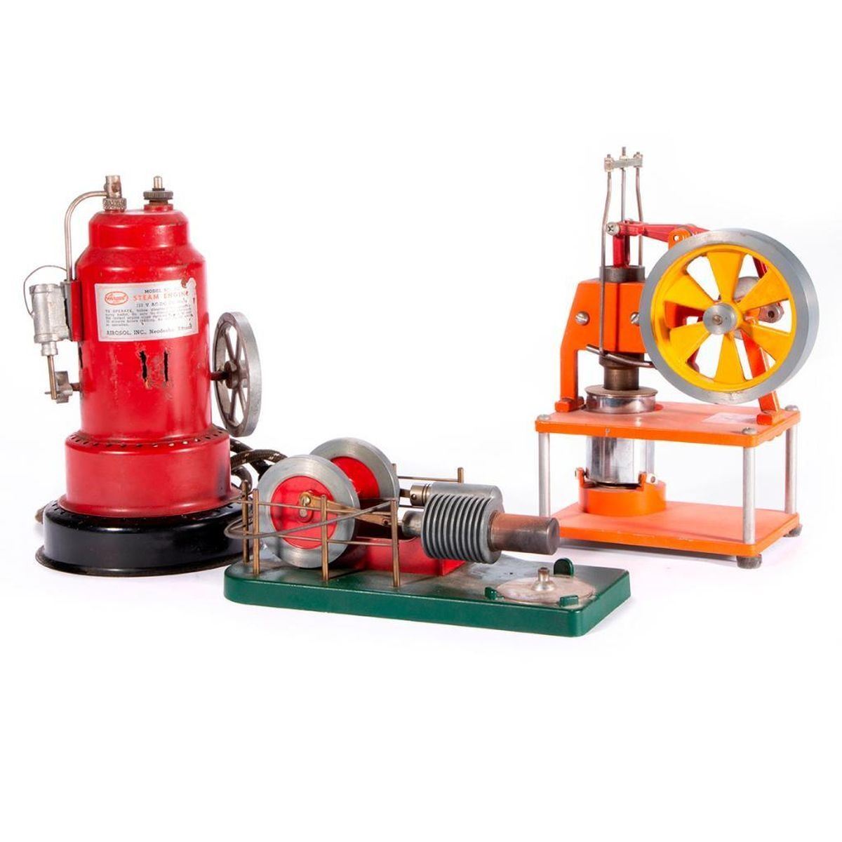 Two vintage Stirling Hot Air engines the largest measuring 8 inches high x 5 x 3 1/2, and a vintage Airosol steam engine measuring 9 inches high x 5 diameter. As shown. Items are sold as is. Please inquire about condition if not otherwise stated.