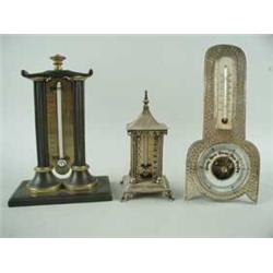 Three mounted thermometers, 1 in a hammered silver frame with barometer,Birmingham 1892, highest 6 1/2" (16.5cm) Est.60/80
