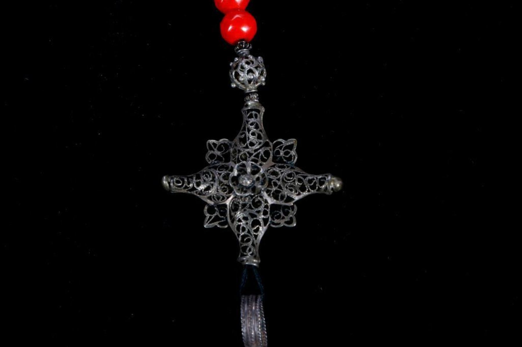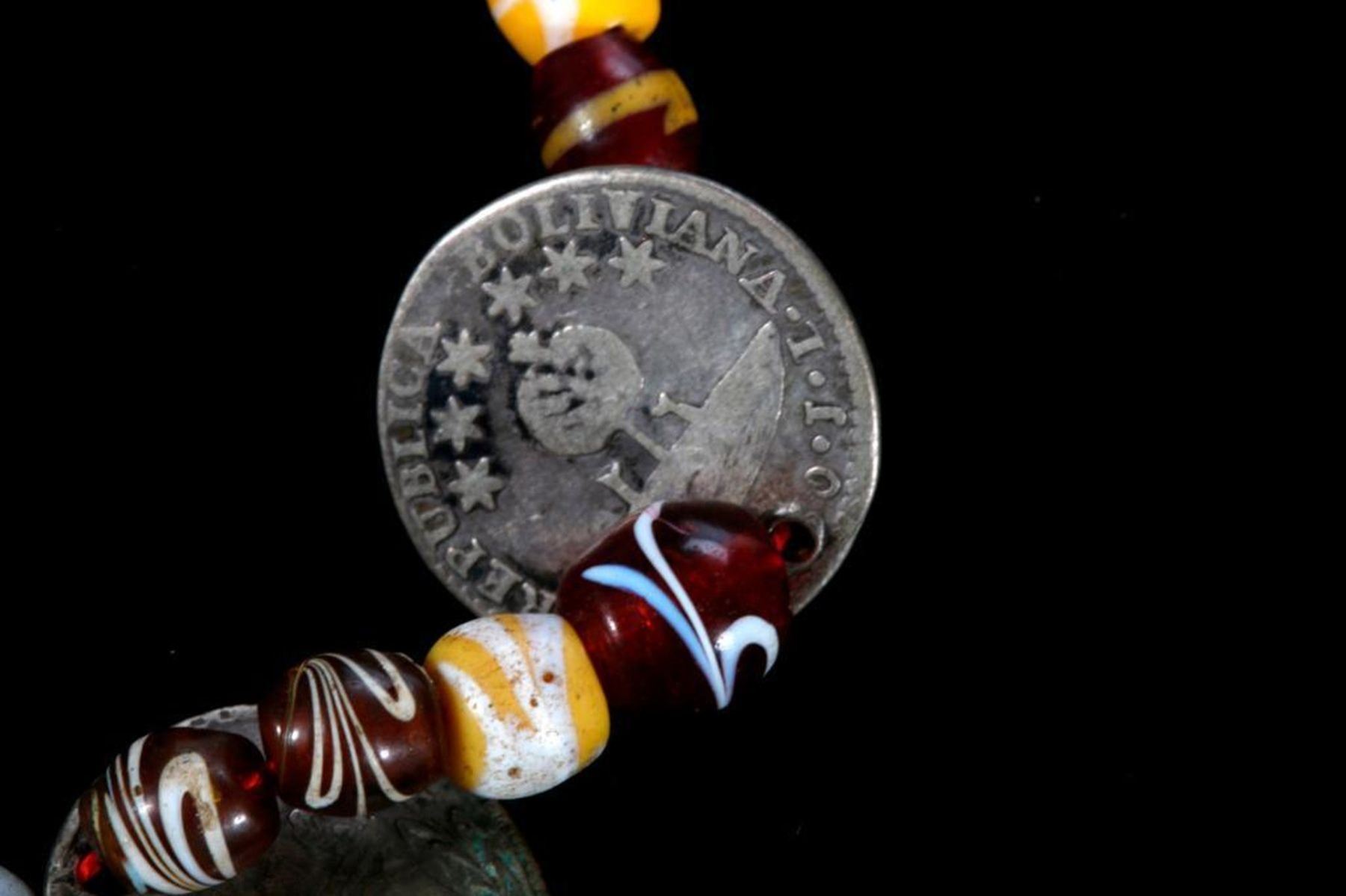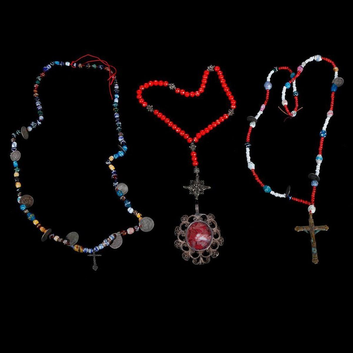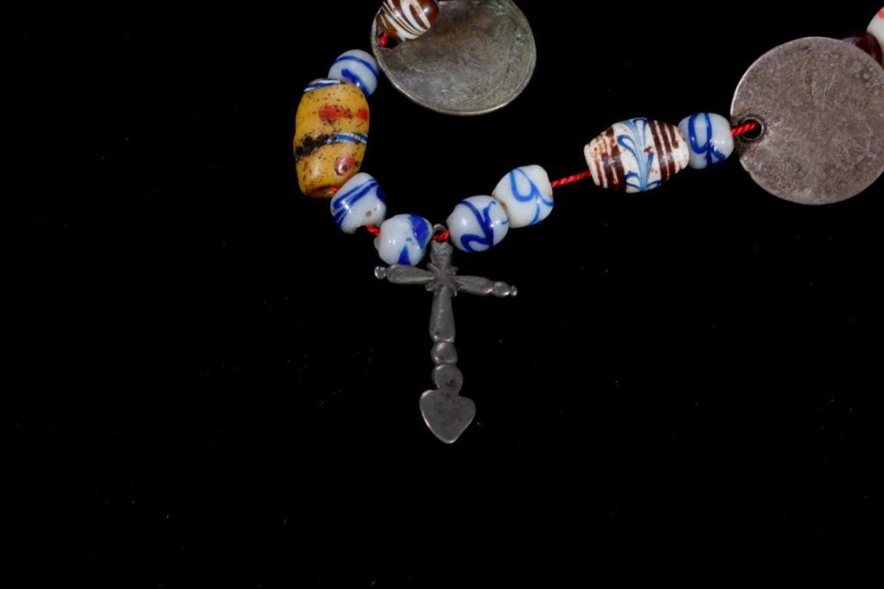 c. 19th/20th century, restrung in modern times, incorporating Bolivian coins, silver crosses and glass beads Largest measuring inches 14 long x 2 3/4.