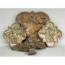 Three oak quatreform panels (two a pair) and a carved figure of an eagle, 39.5cm Est. 200/250...