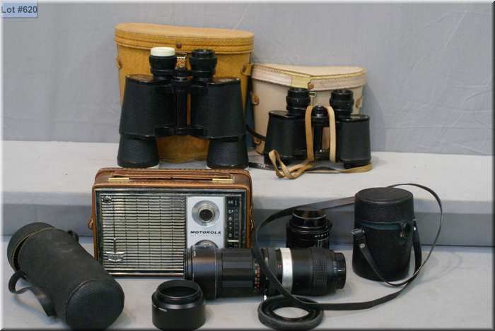 Three pairs of binoculars including a Carl Wetzlater 10 X 50, camera lenses and a portable radio