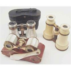 Three pairs of late 19th century opera glasses, comprising a pair in ivory, a mother-of-pearl pair in case by Max Opitz of Berlin, and another pair of mother-of-pearl glasses with side handle, in case £100-150