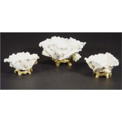 Three piece Victorian Moore Brothers garniture of bowls, relief moulded with leaves and flowers on gilt feet, printed marks to bases, largest 20cm in length