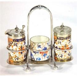 Three piece Victorian cruet set, decorated in an Imari style with silver plated stand…