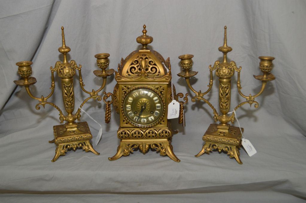 Three piece antique gilt chiming mantle clock with porcelain accented dial, overall pierce work, dou