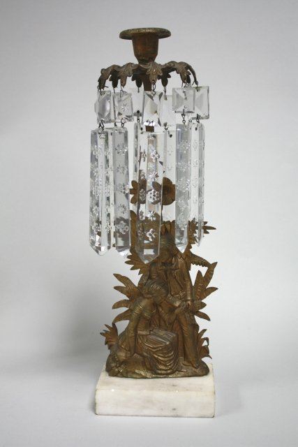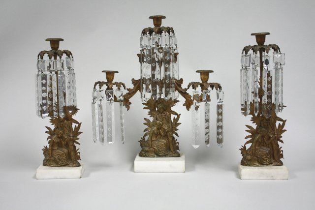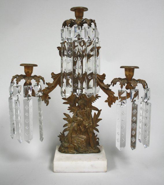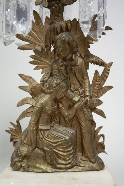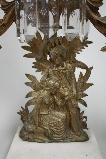 Bronze, crystal and marble base. Largest approx. 18" H x 15" W. Smaller approx. 15" H. 10 crystals missing on large candelbra.