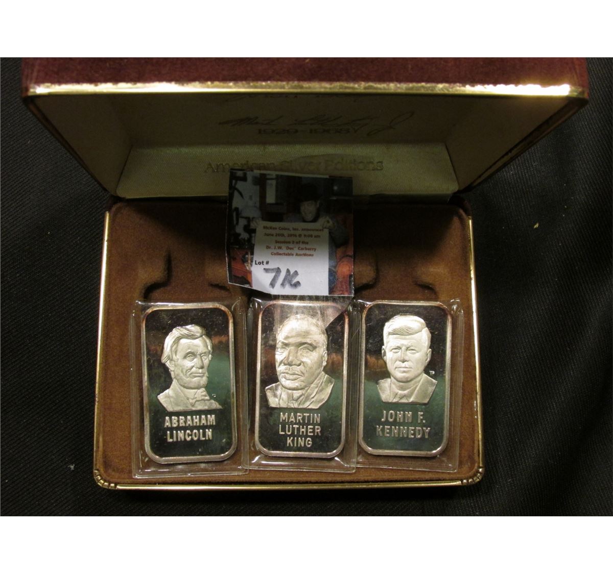Three-piece encased Champions of Liberty Set of One Troy Ounce .999 Fine Silver Ingots, "Abraham Lincoln", "Martin Luther King", & "John F. Kennedy".