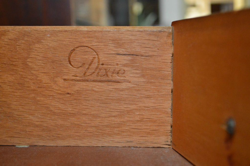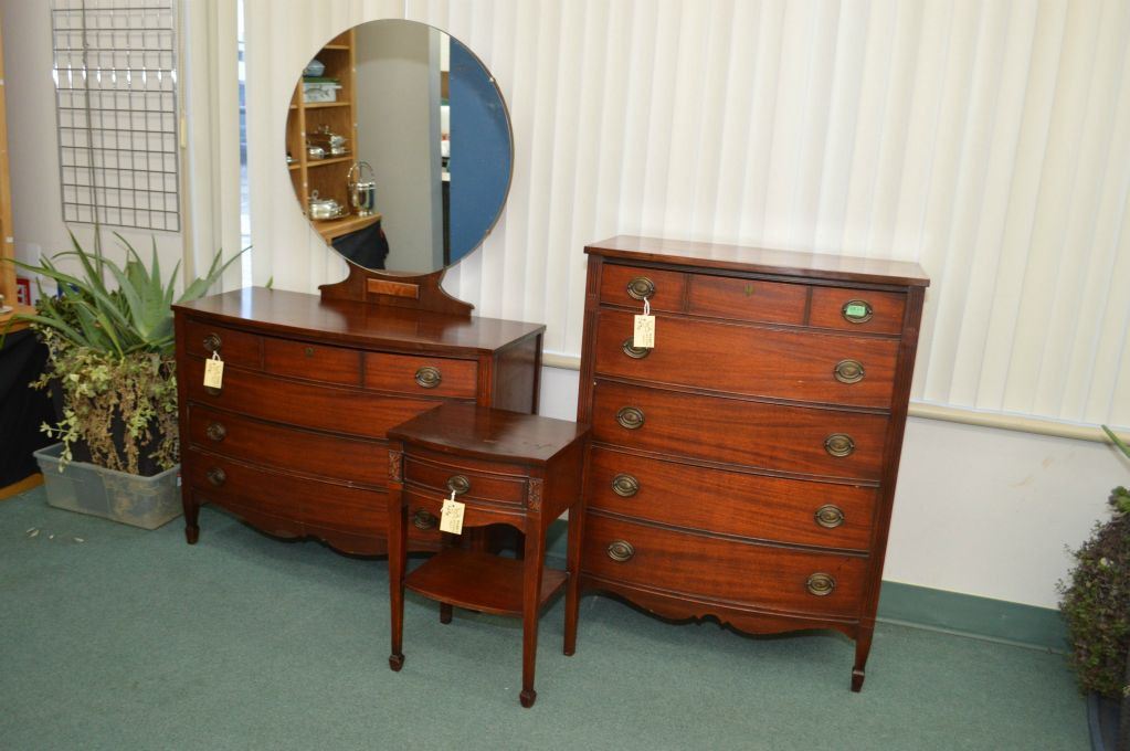 Three piece mahogany Regency style bedroom suite including mirrored dresser, five drawer highboy and a single drawer night table