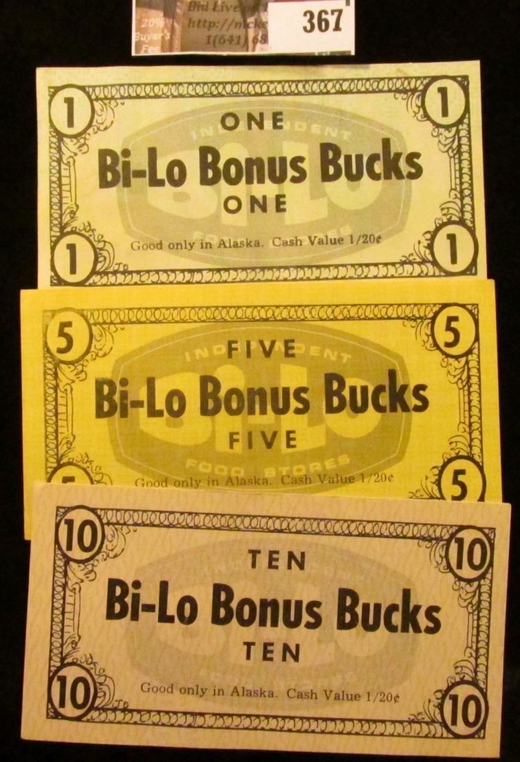 Three-piece set of "Bi-Lo Bonus Bucks…Good Only in Alaska", Crispt Unc.