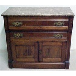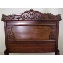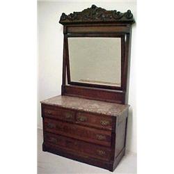 Three piece walnut Victorian bedroom set including marble top washstand, highback double bed, and marbletop dresser with beveled swivel mirror, C.1870, (some veneer damage on washstand) Estimate 1500/2500