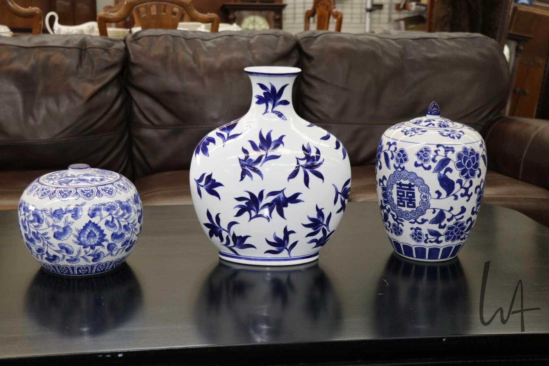 Three pieces of blue and white china including two lidded ginger jars and a 14" vase, two labeled Pi