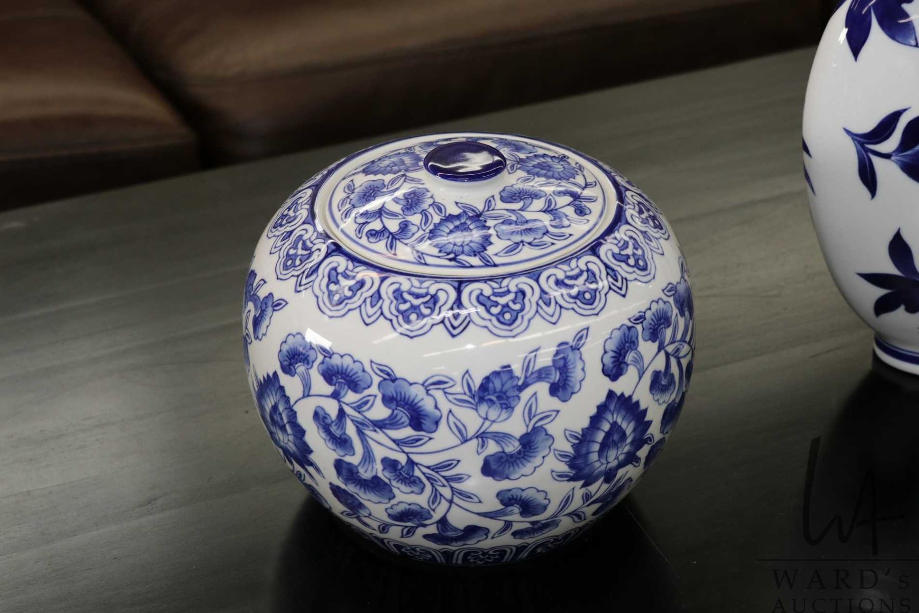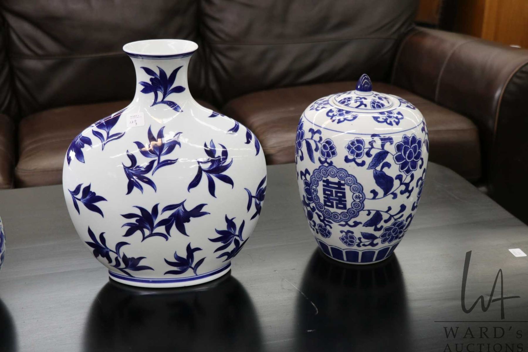 Three pieces of blue and white china including two lidded ginger jars and a 14" vase, two labeled Pier One