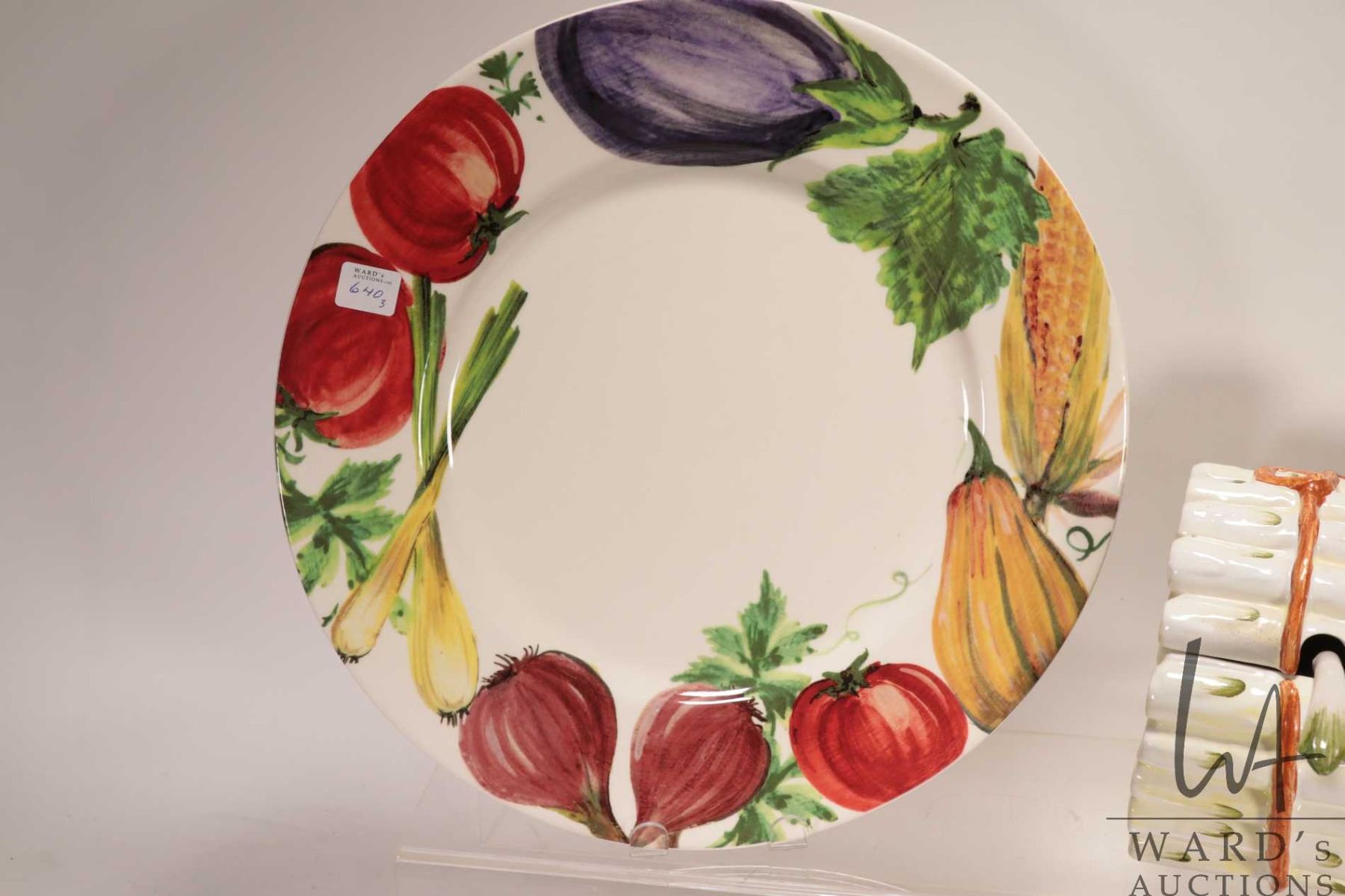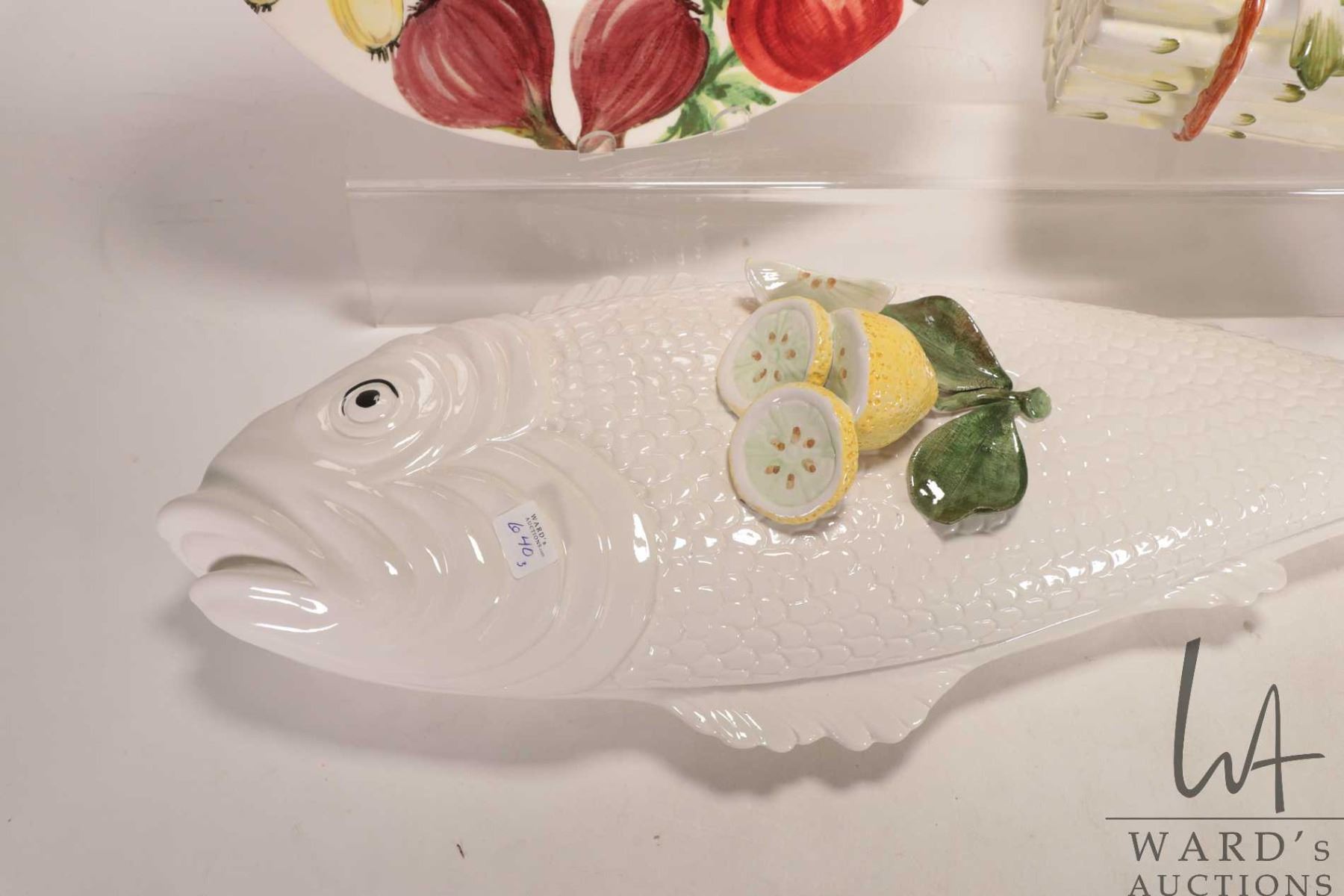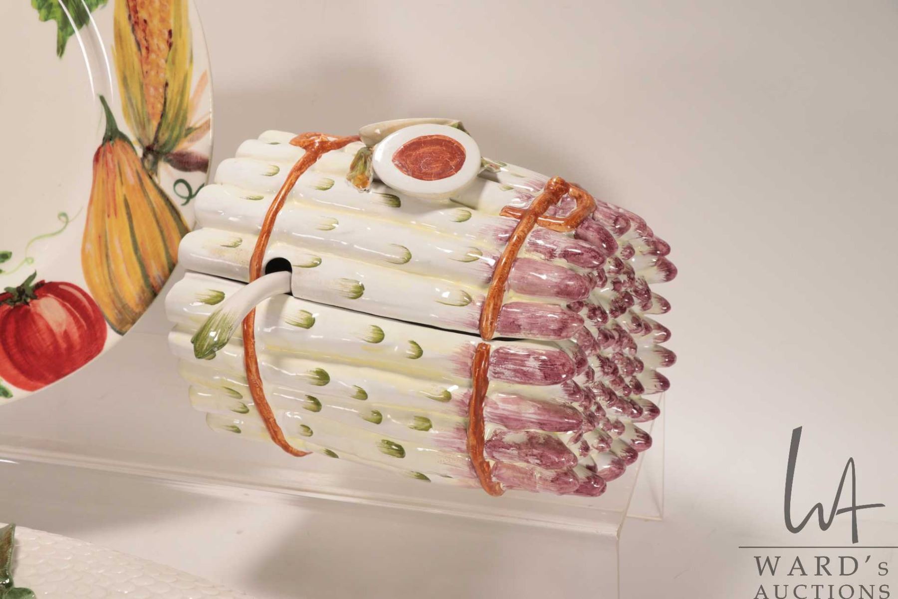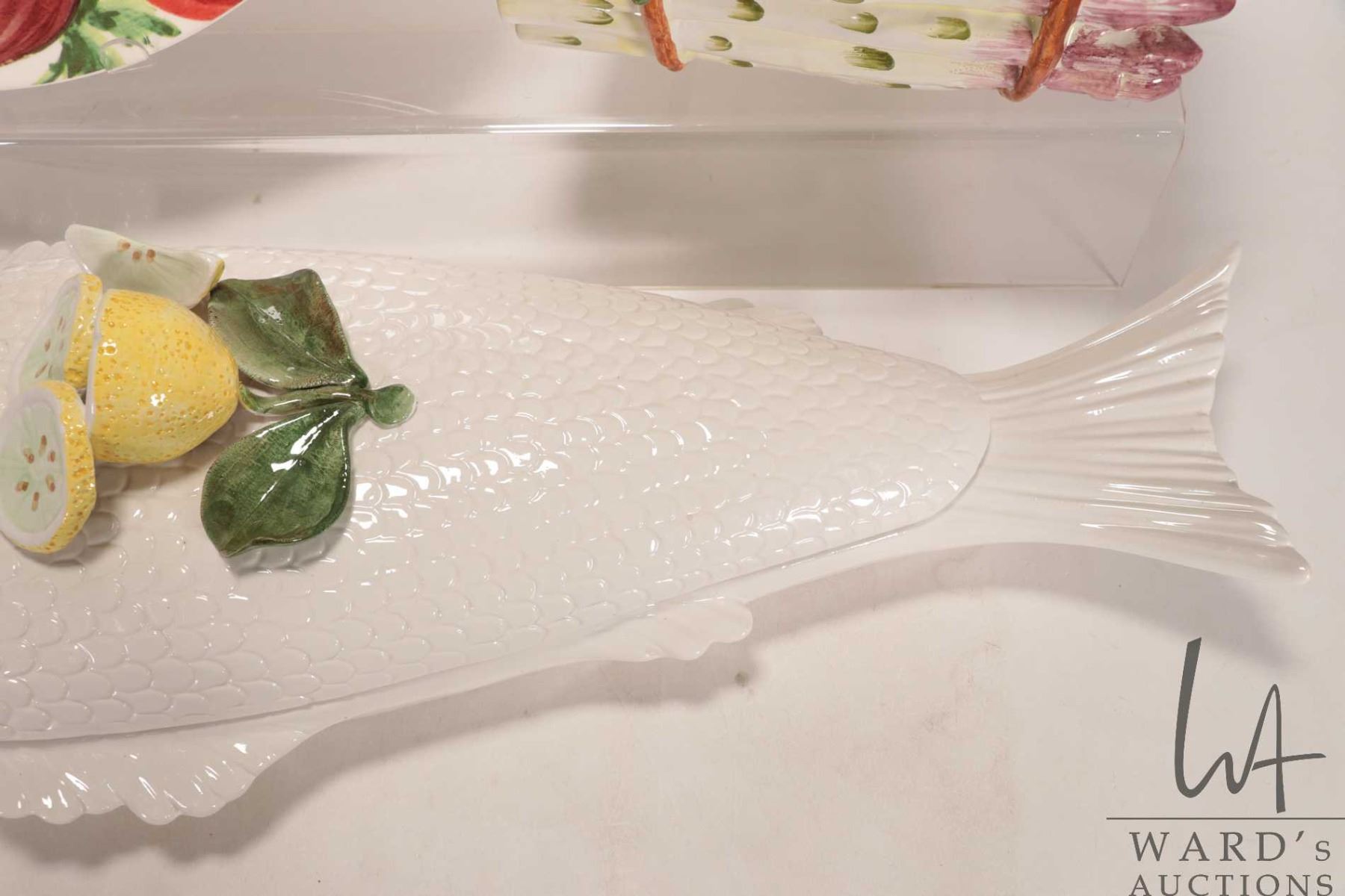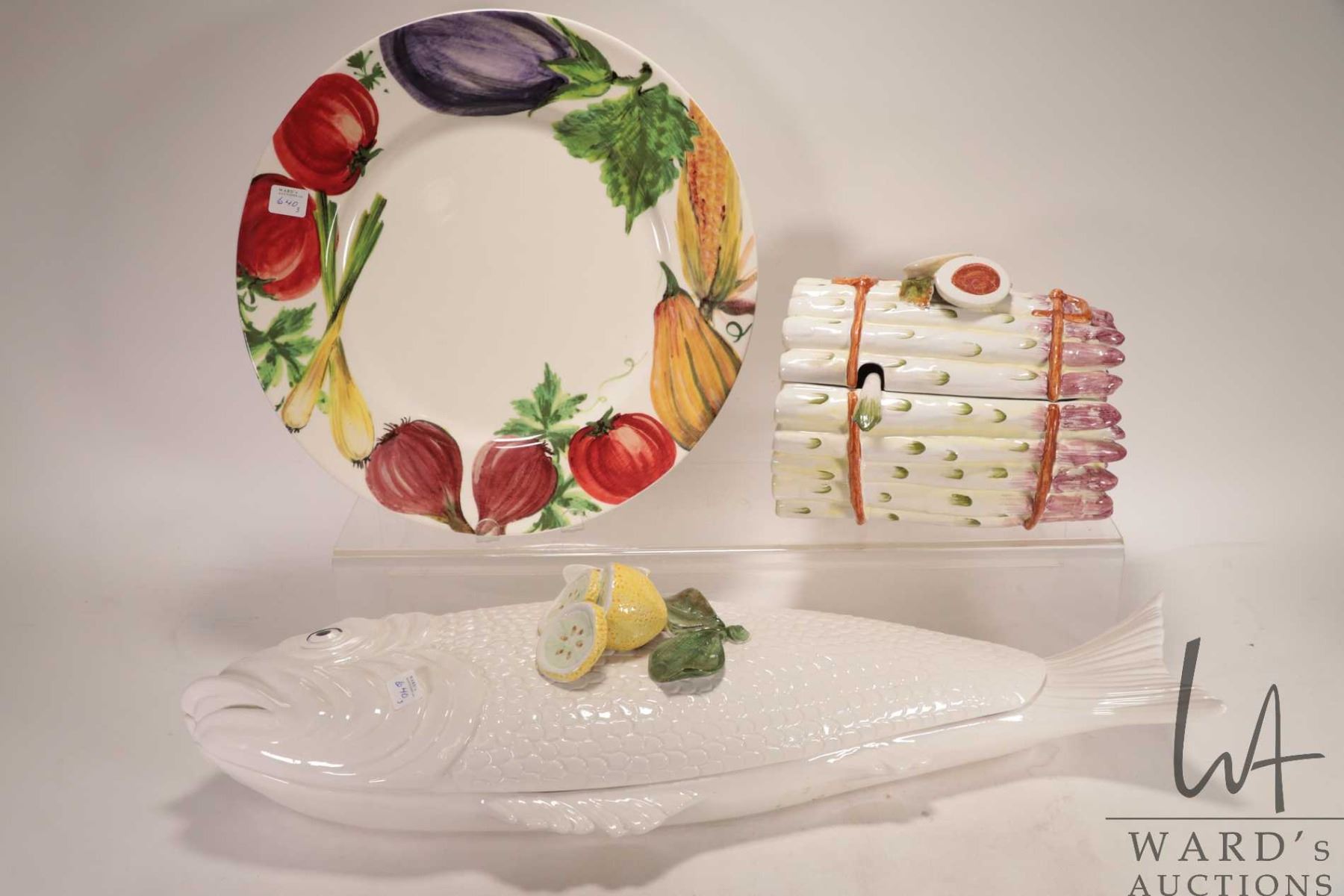 Three pieces of glazed ceramic serving pieces including 14 1/2" charger, asparagus motif lidded tureen and 25" lidded fish dish, two marked "Made in Italy"