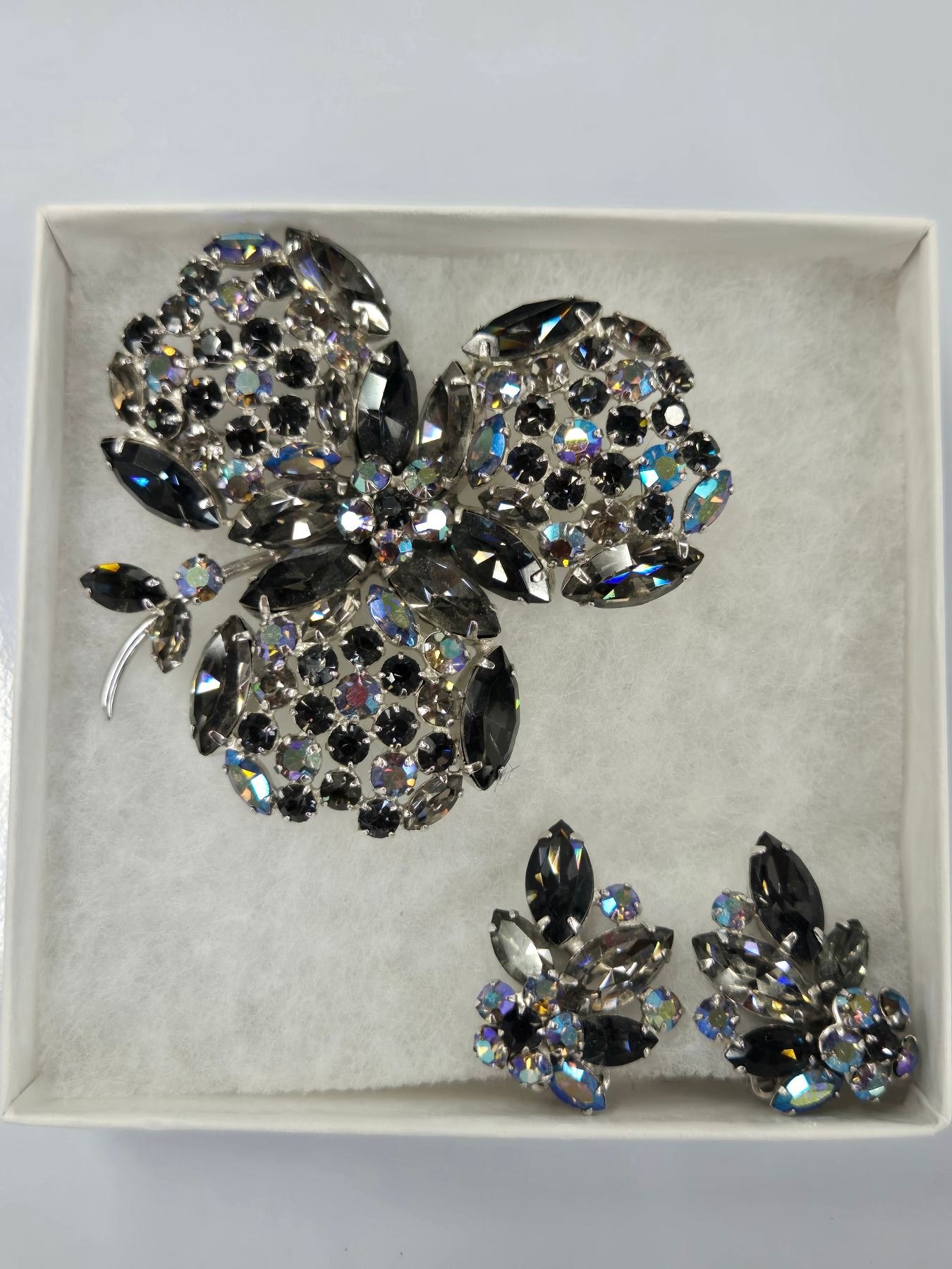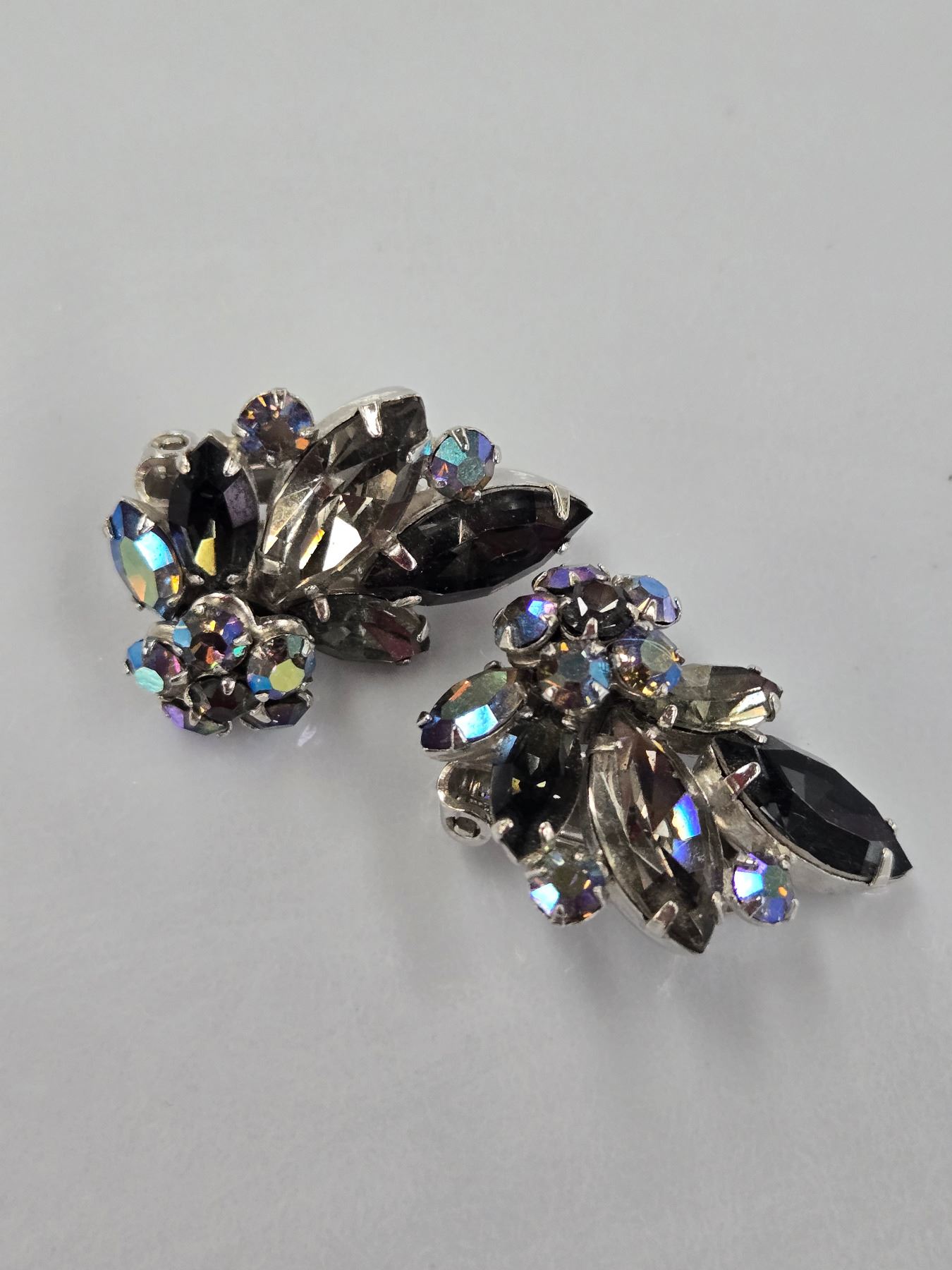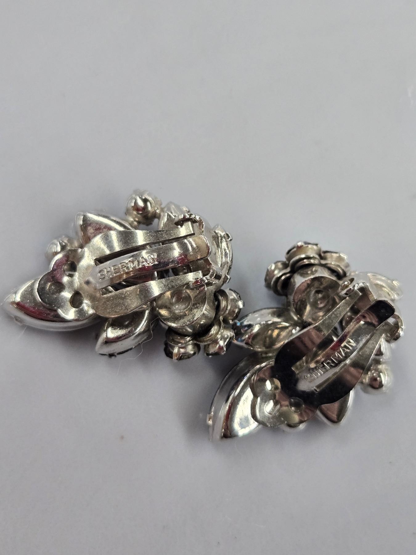 Three pieces of vintage signed Sherman jewellery including iridescent starlight three leaf clover brooch and a pair of coordinating signed Sherman earrings, all with silvertone backing