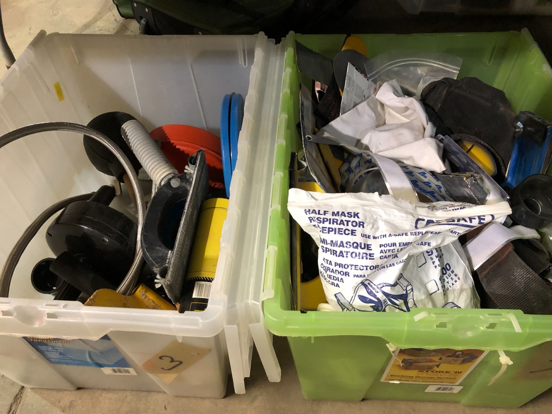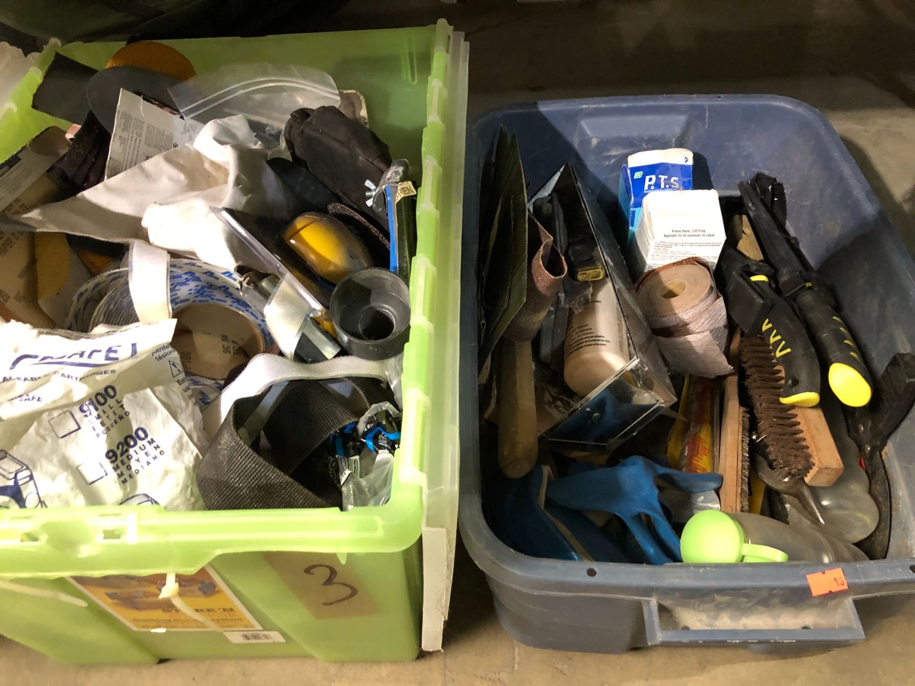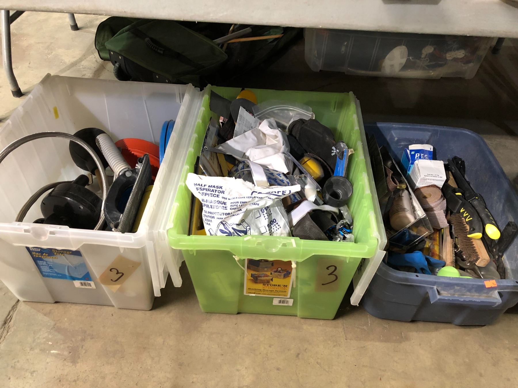 Three plastic storage boxes of assorted tools & misc. hardware