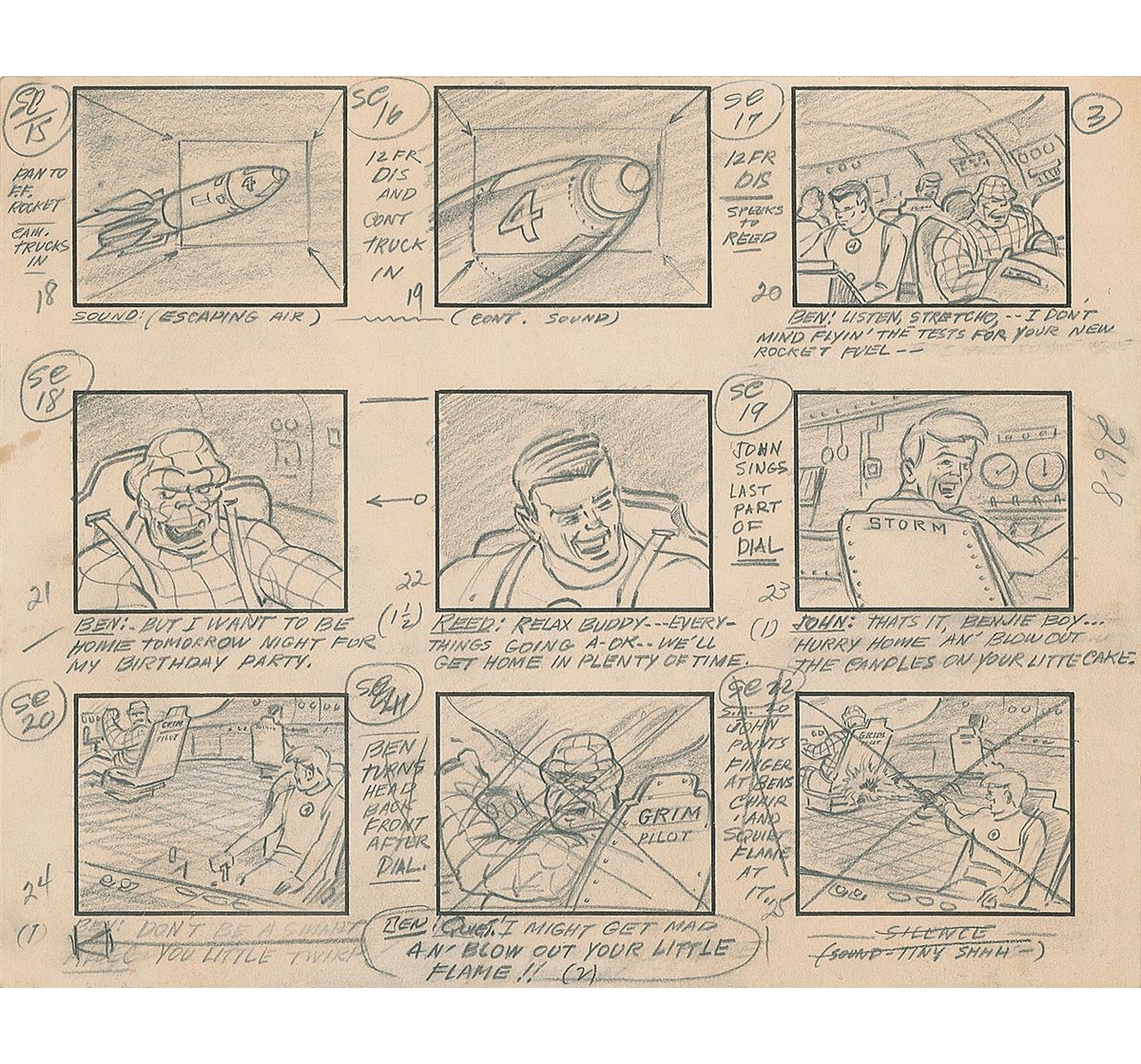 (Hanna-Barbera Studios, 1967) Three original production storyboard pages from Fantastic Four, each featuring nine panels, for the episode entitled “Behold a Distant Star.” Accomplished in graphite on untrimmed 12.5 x 10 illustration paper. The scenes illustrated show the characters—Mister Fantastic (Reed), Invisible Girl (Sue), The Human Torch (John), and The Thing (Ben)—attempting to pilot a rocket ship and a violent encounter within the Skrull Galaxy. Produced by Hanna-Barbera, this was the first animated series based on Marvel’s Fantastic Four comics. “Behold a Distant Star” aired as the ninth episode on November 4, 1967; as only 20 episodes were produced, production materials from the show are quite scarce.