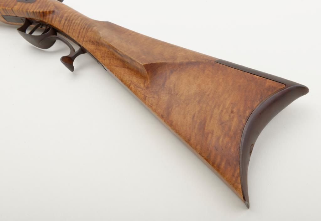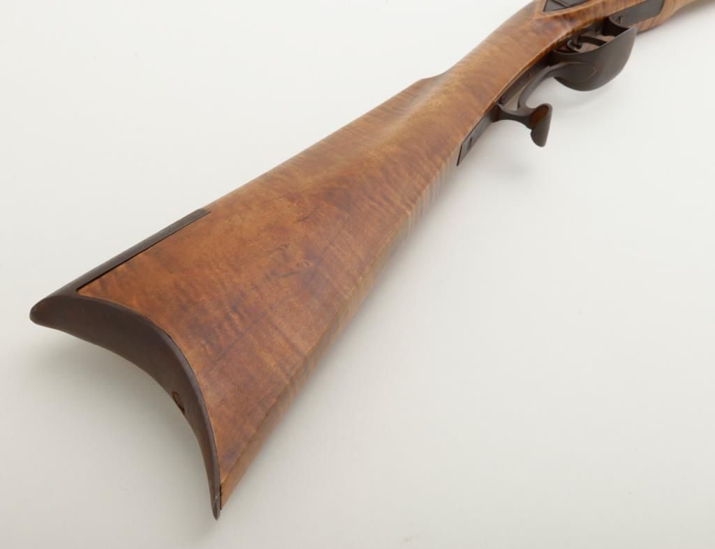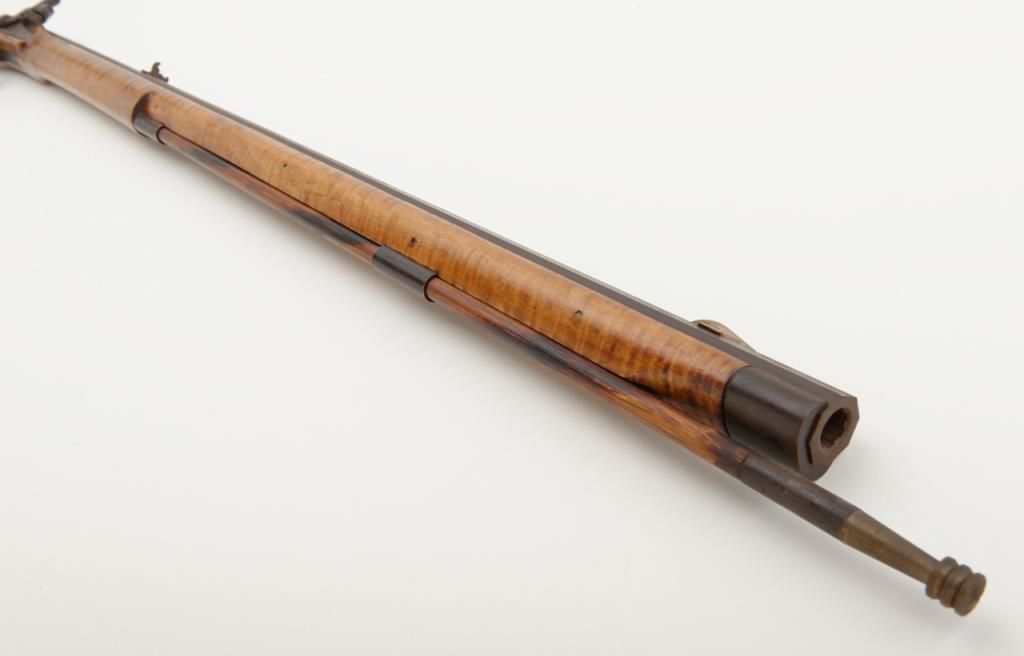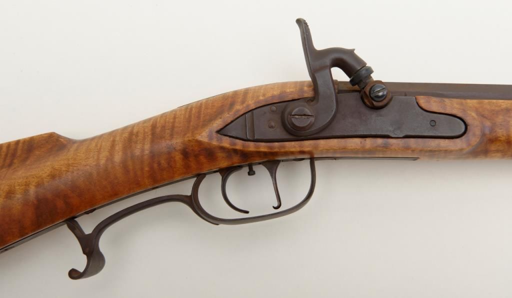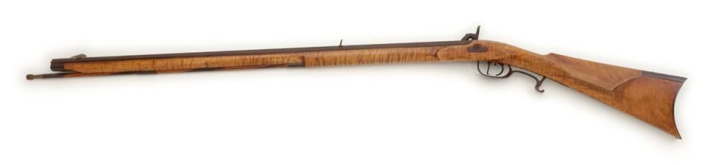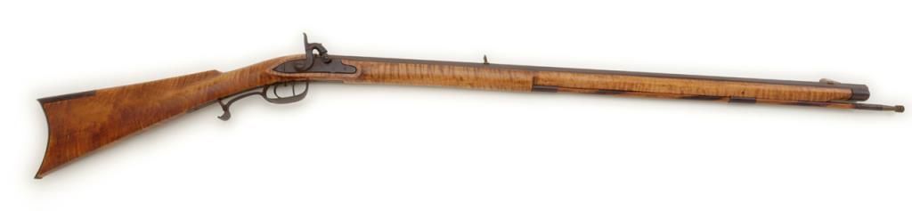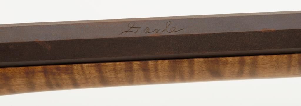 Three quarter sized modern percussion full stock rifle, .45 cal., 32” octagon barrel signed “Gayle”, brown finish, double set triggers working at time of description, wood stock, #NVSN in overall very good condition showing scattered light surface rust on the barrel from storage that should clean, good action and bore, very good to fine wood stock with beautiful graining. Est.: $250-$350.