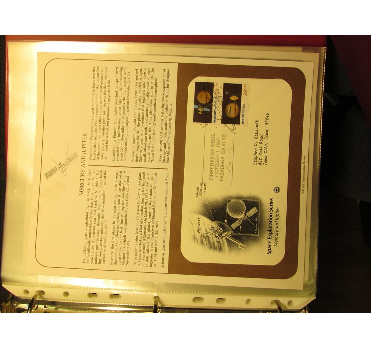 Three-ring Spiral Notebook full of First Day of Issue. Including Space Exploration, Statehood, & etc. Each stamped with up to .58c in U.S. Postage, Postmarked in the related Cities, and superb Artwork. Each individually displayed on a separate page with information about the covers depiction.