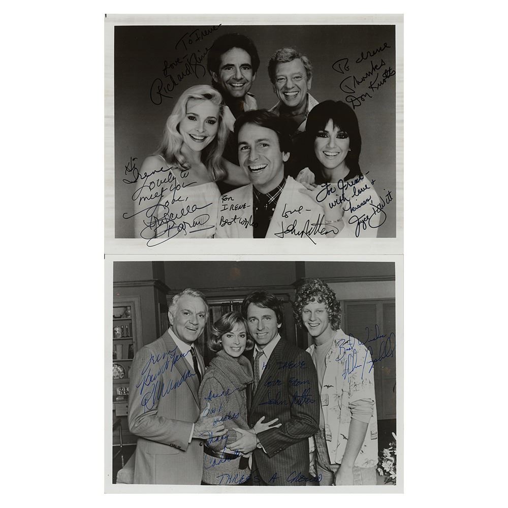 Two signed photos: a glossy 10 x 8 photo of the Three's Company cast, signed and inscribed in black felt tip to "Irene" by John Ritter, Joyce DeWitt, Priscilla Barnes, Richard Kline, and Don Knotts; and a glossy 10 x 8 photos of the cast of the spin-off sitcom Three's a Crowd, signed and inscribed in blue felt tip to "Irene" by John Ritter, Mary Cadorette, Robert Mandan, and Alan Campbell. In overall fine condition.