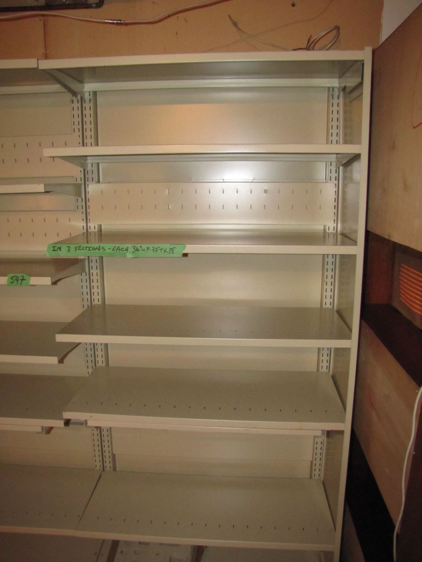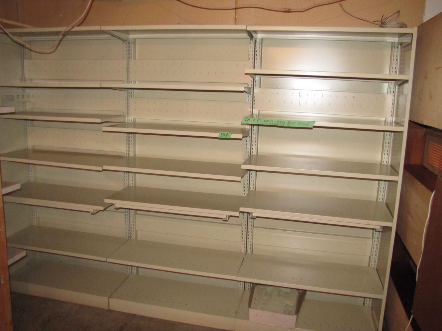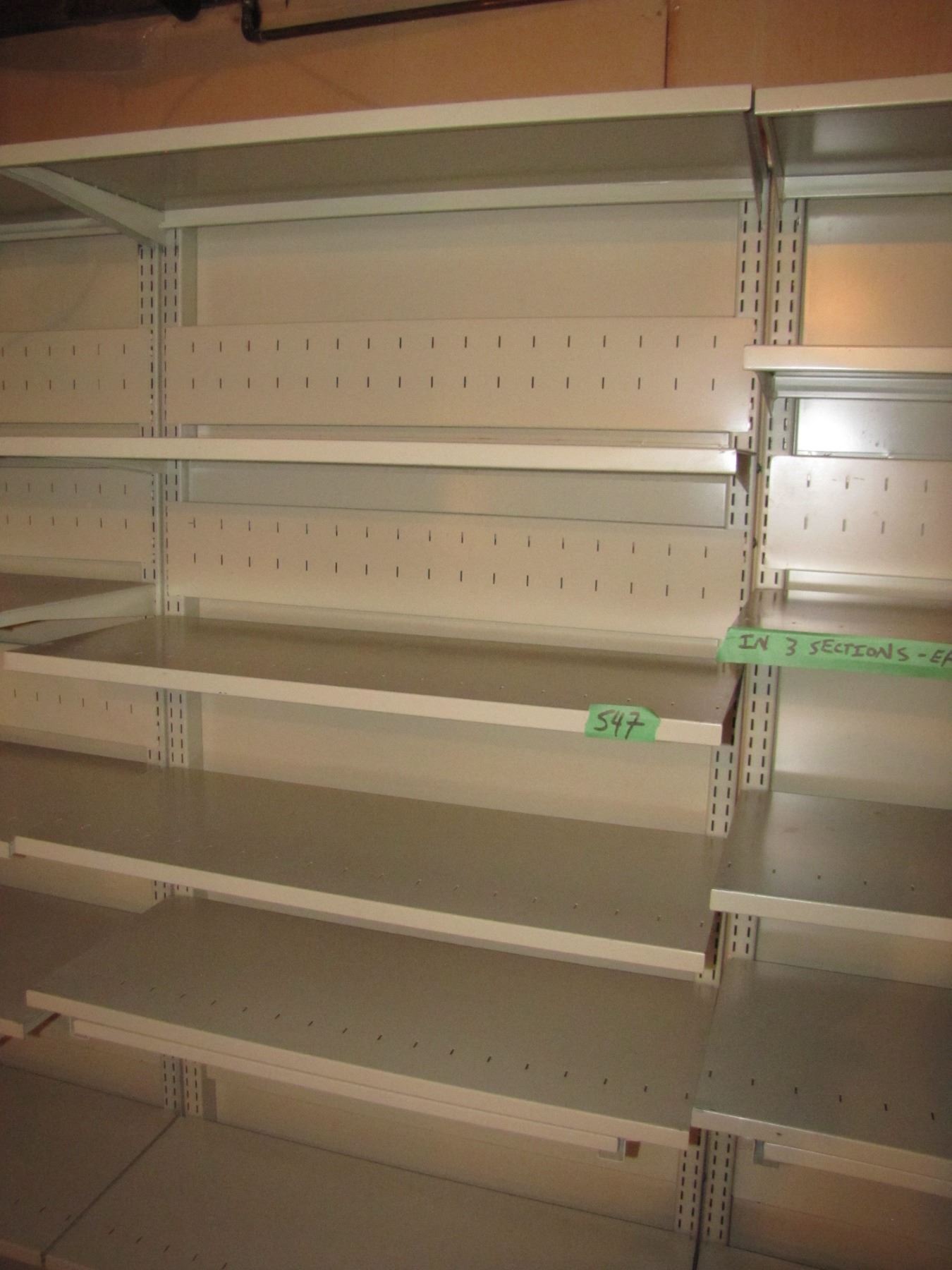 Three sections of metal shelving for storage