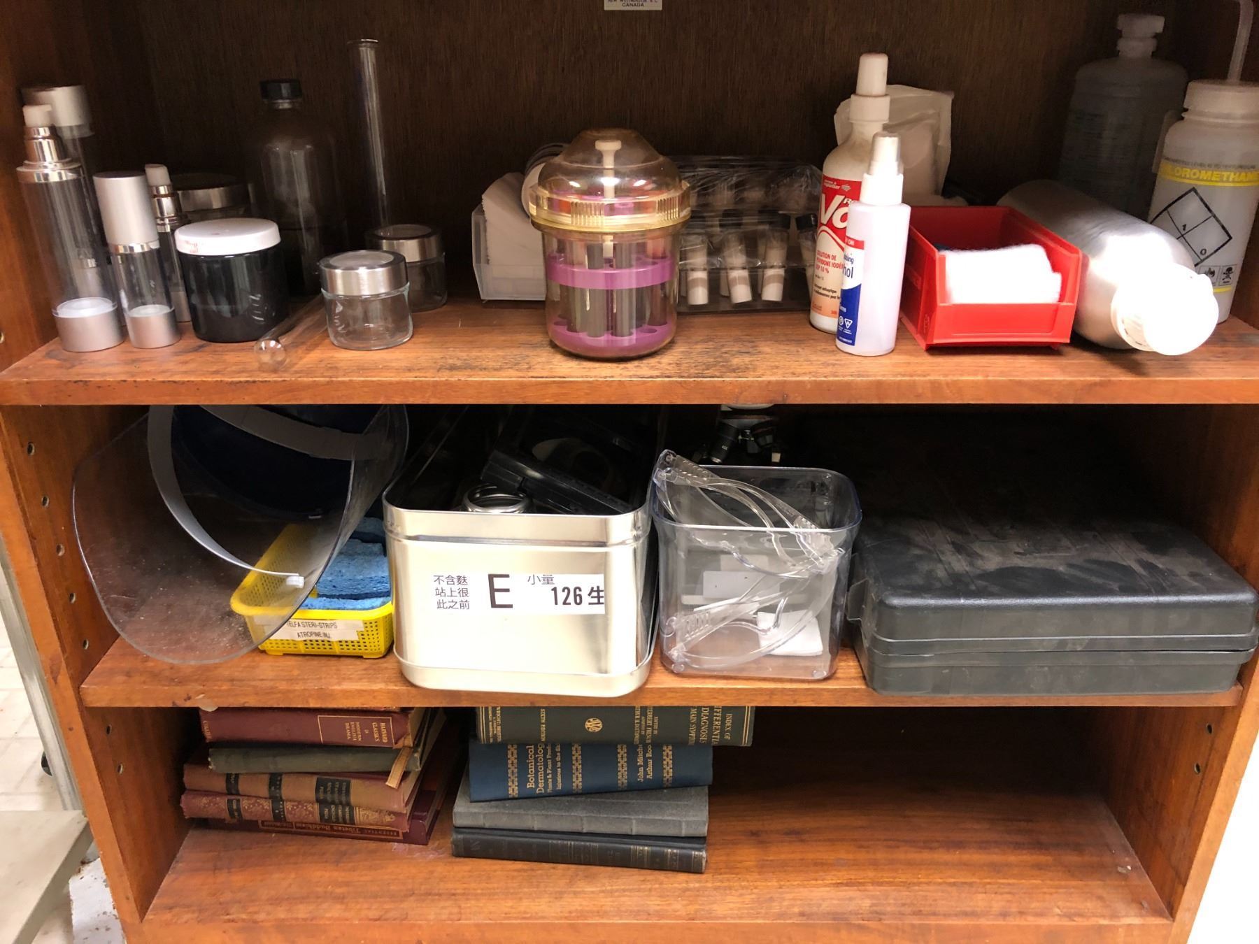Three shelves of assorted medical lab equipment & assorted books from the popular Sci-fi series
