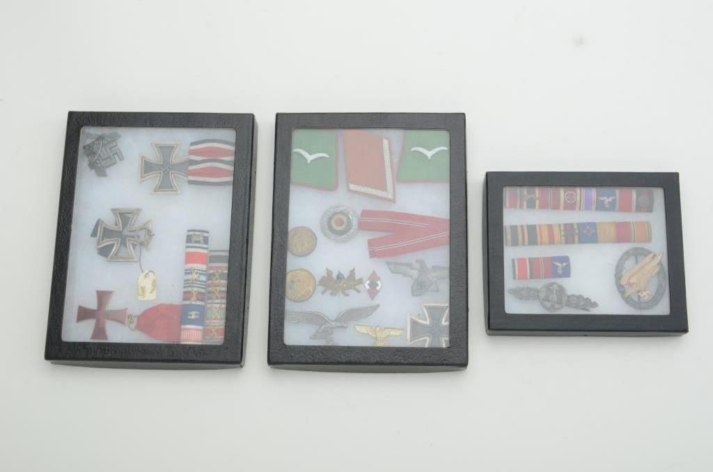 Three small riker cases of misc. nazi medals and ribbons plus a small framed group of post war German pilot ribbons. Est.: $200-$300.