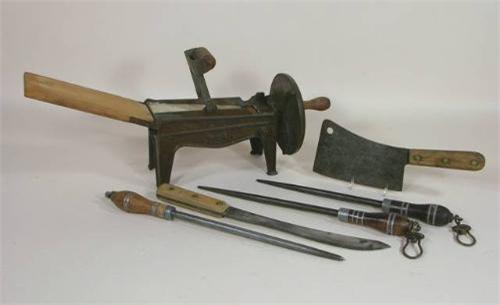 Three steels, butcher knife, cleaver, Teck 1 noodle cutter.